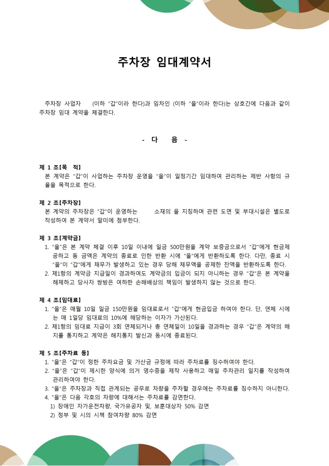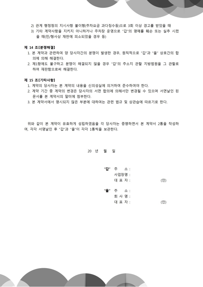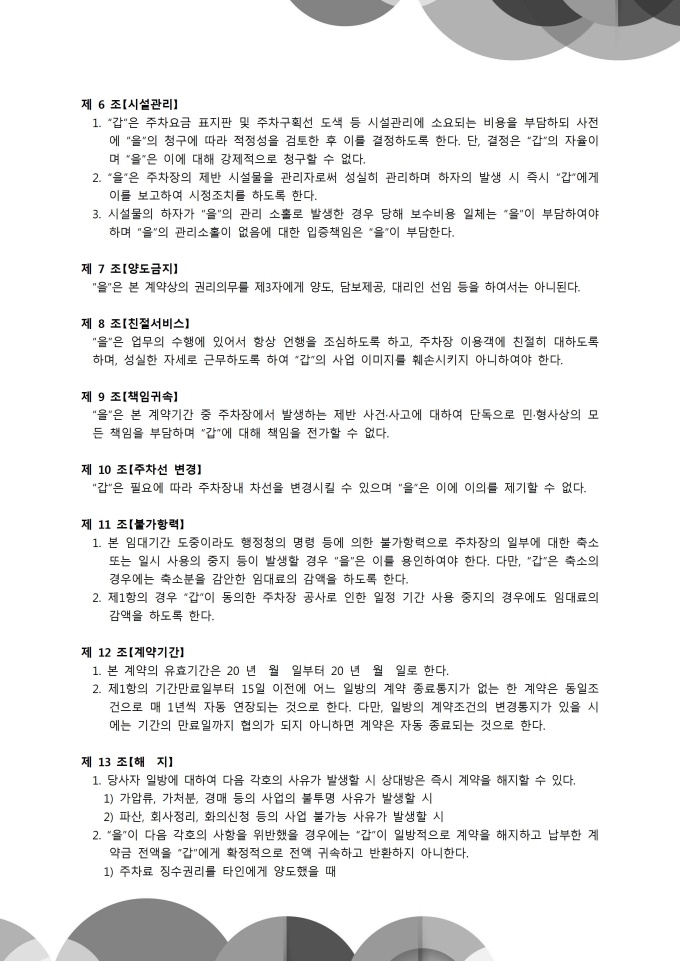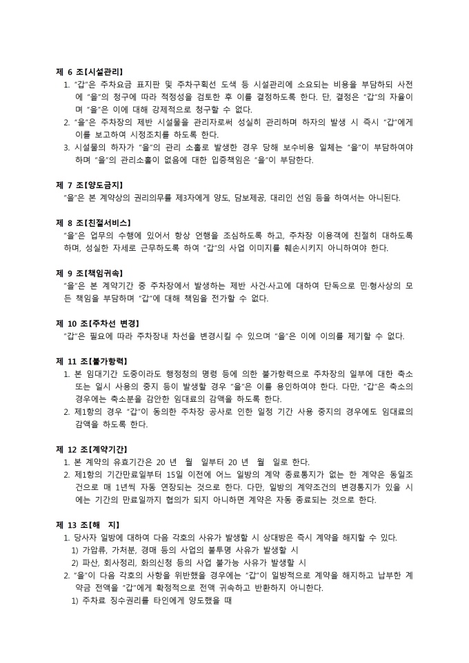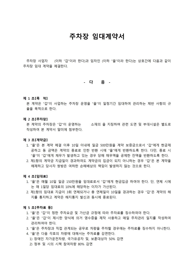 주차장 사업자와 임차인 상호간에 주차장 임대 계약 체결 시 사용할 수 있는 계약서 샘플입니다.