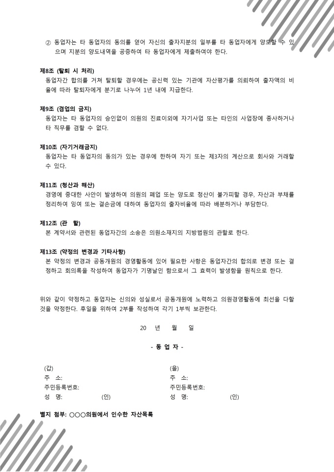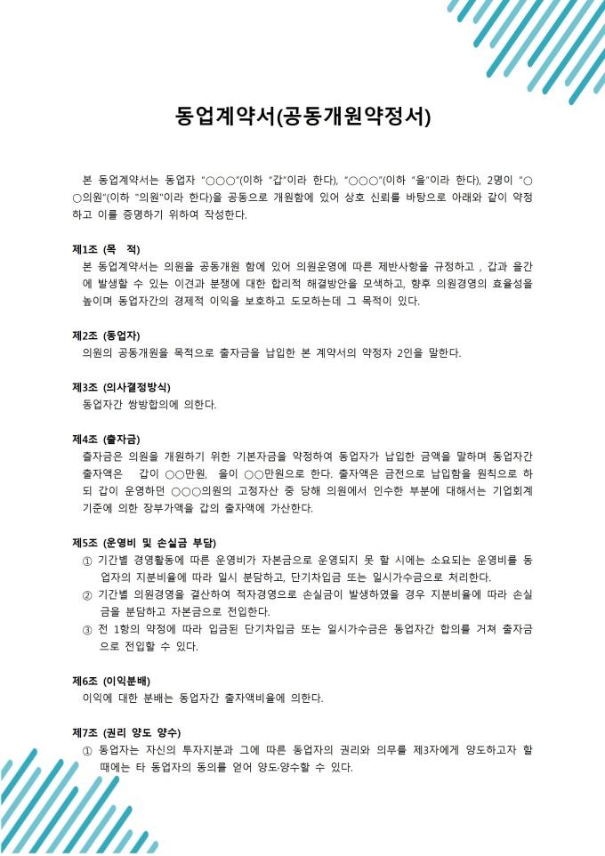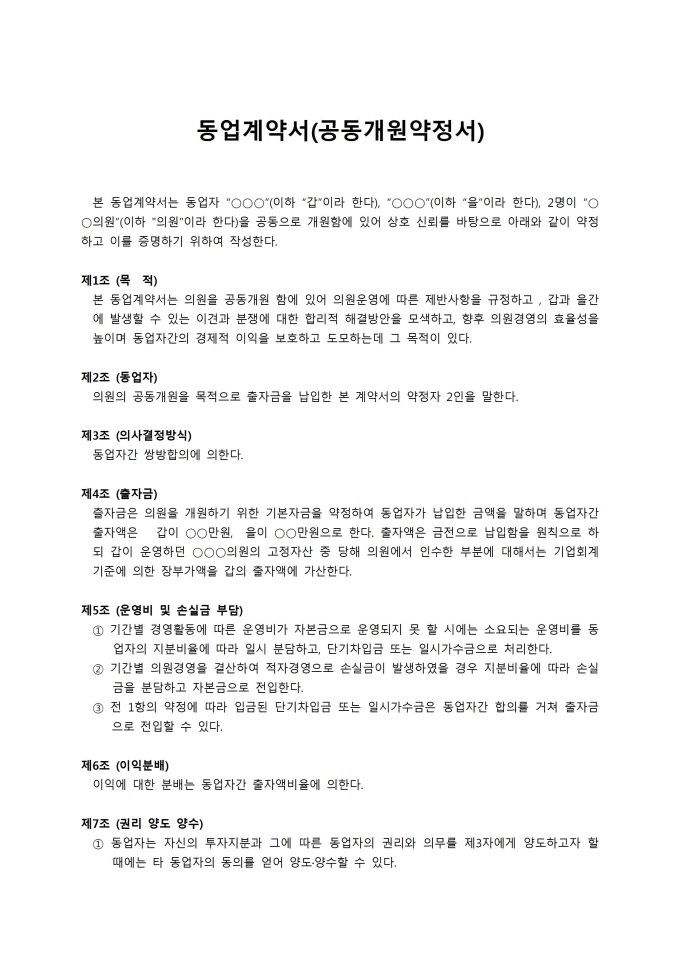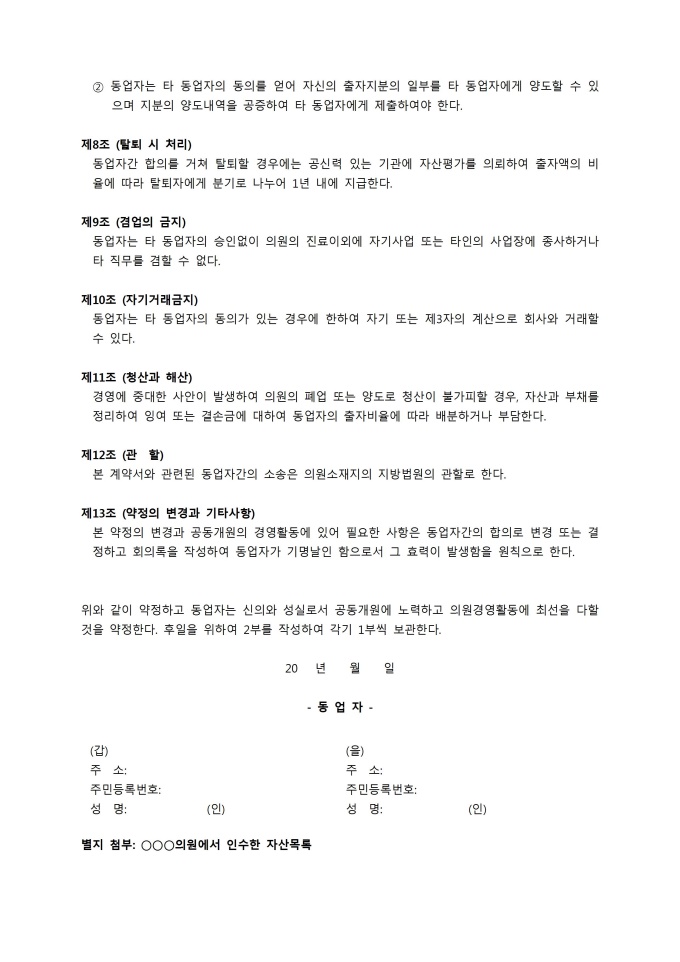 병원 동업계약서 샘플입니다. 목적, 동업자, 의사결정방식, 출자금, 운영비 및 손실금 부담 등 13개 조항으로 구성되어있습니다.