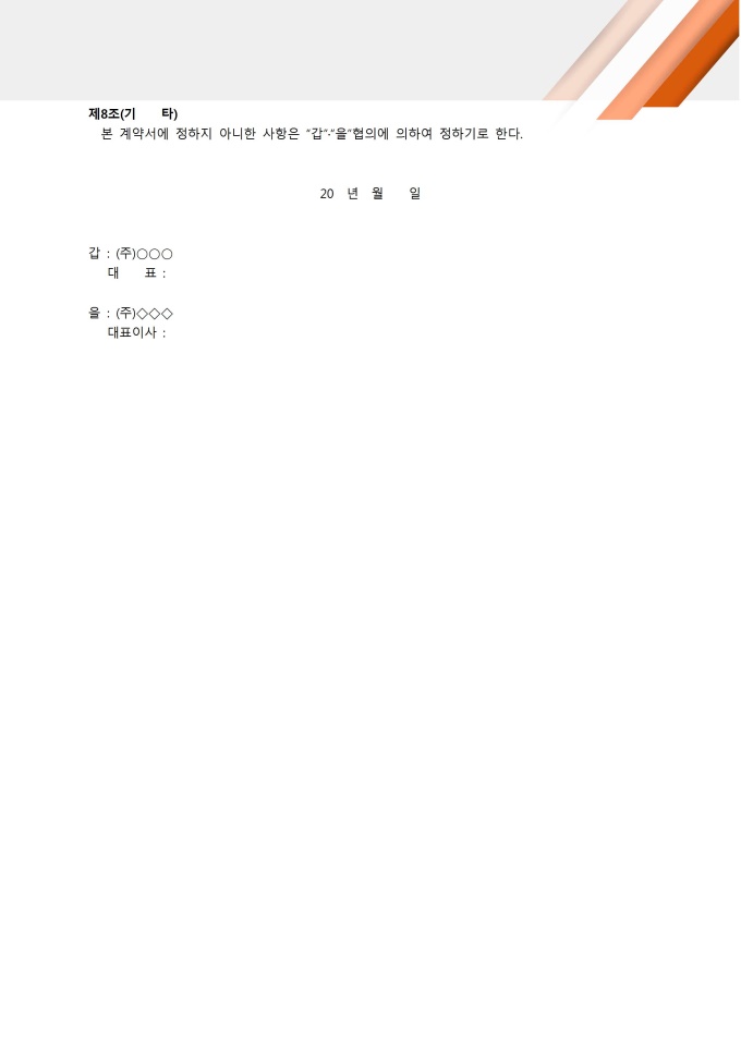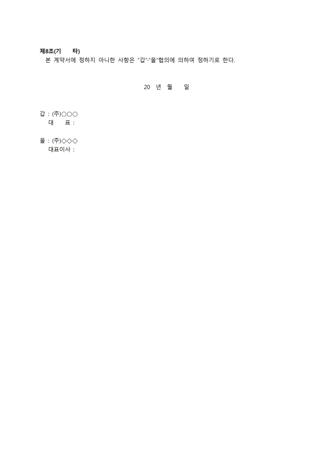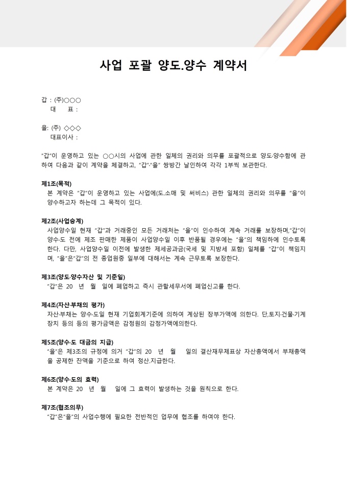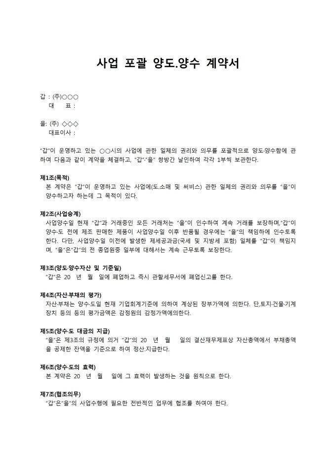 목적, 사업승계, 양도양수자산 및 기준일, 자산부채의 평가, 양수도 대금의 지급, 양수도의 효력, 협조의무, 기타등 총 8조항으로 구성된 사업포괄양도양수계약서양식입니다.