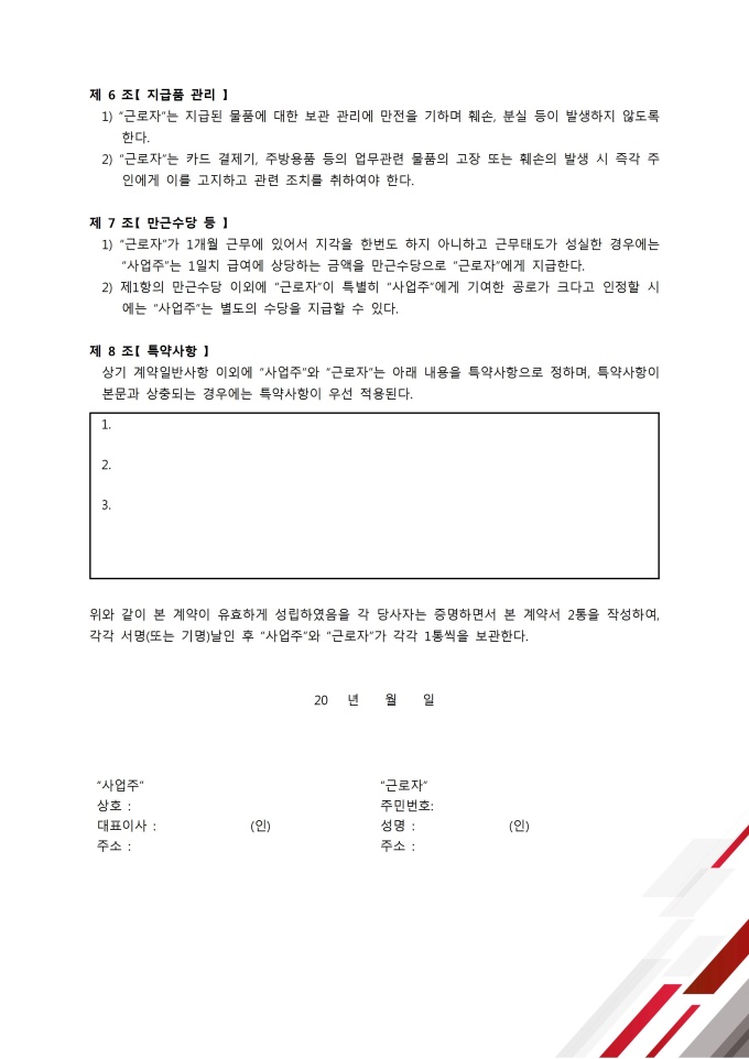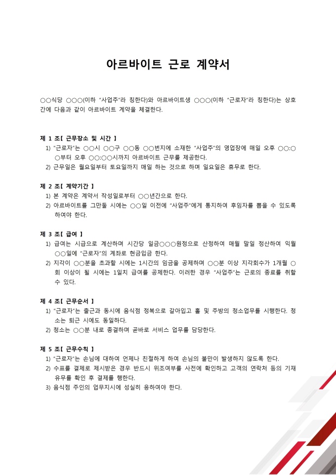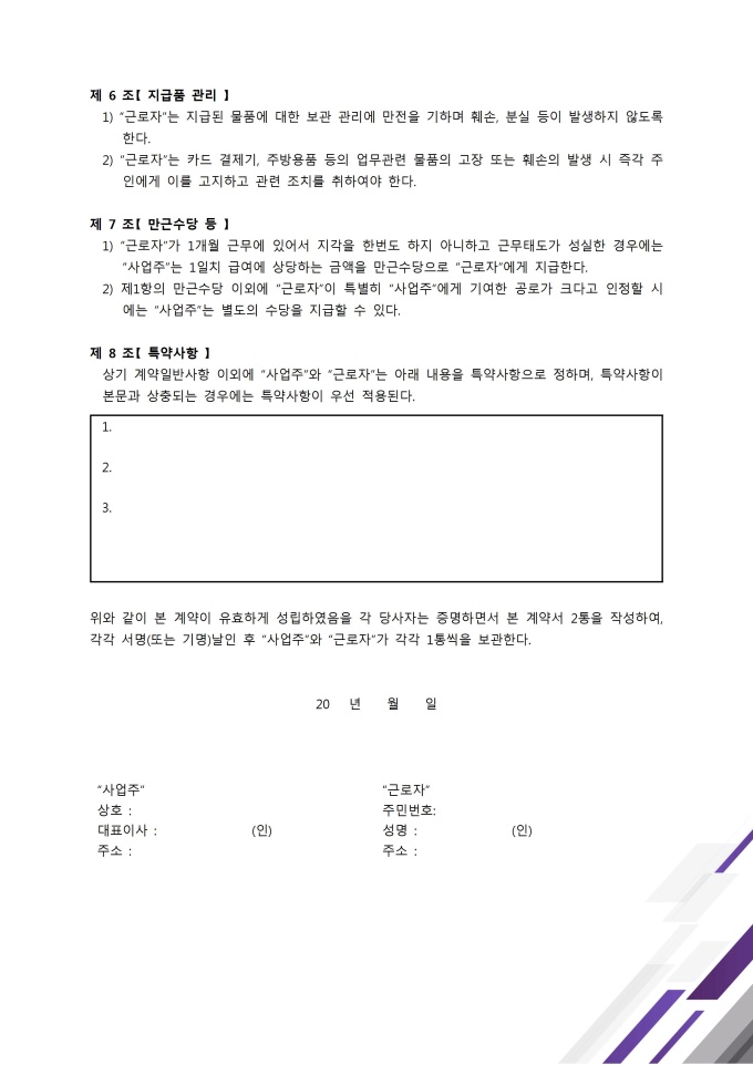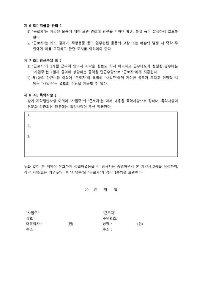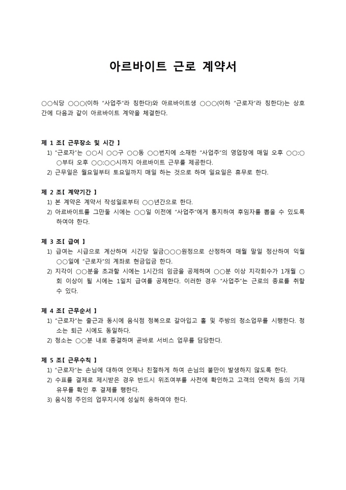 8개 조항으로 구성되어있는 음식점 아르바이트 근로계약서 양식입니다. 근무장소 및 시간, 계약기간, 급여, 근무순서, 근무수칙, 지급품 관리, 만근수당, 특약사항의 조항으로 구성되어있습니다.