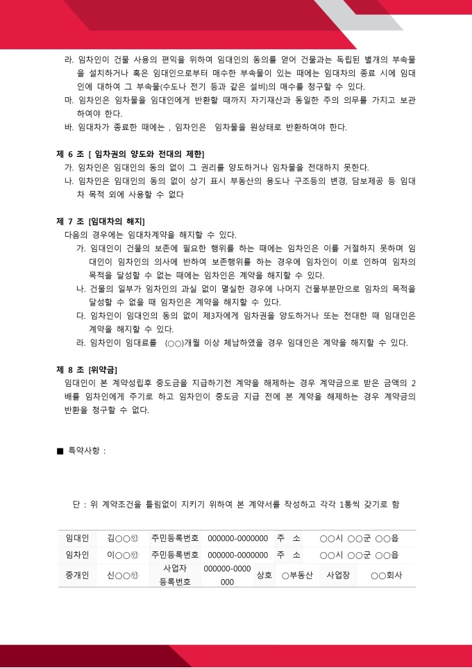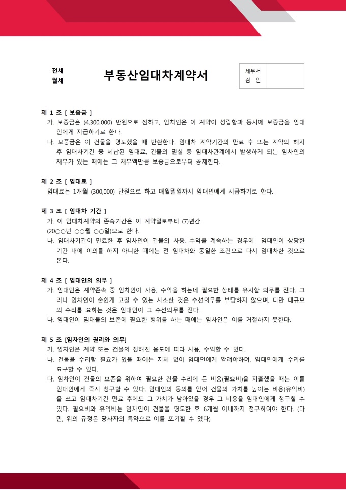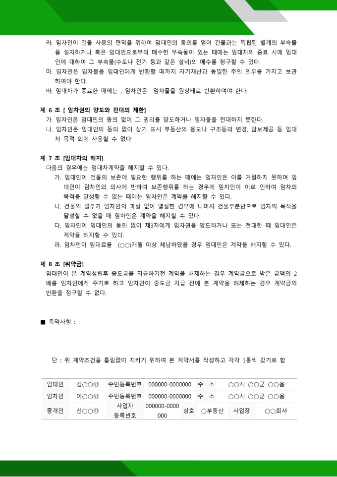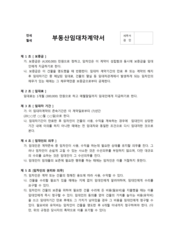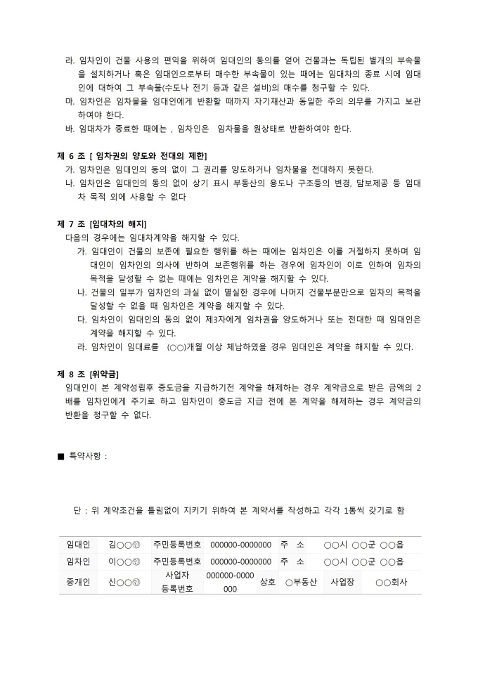부동산 중개업자(복덕방)에 대한 과세자료 수집사무취급 규정에 근거한 부동산 임대차 계약서 양식입니다. 보증금, 임대료, 임대차 기간등의 총 8개의 계약조항이 명시되어 있습니다.