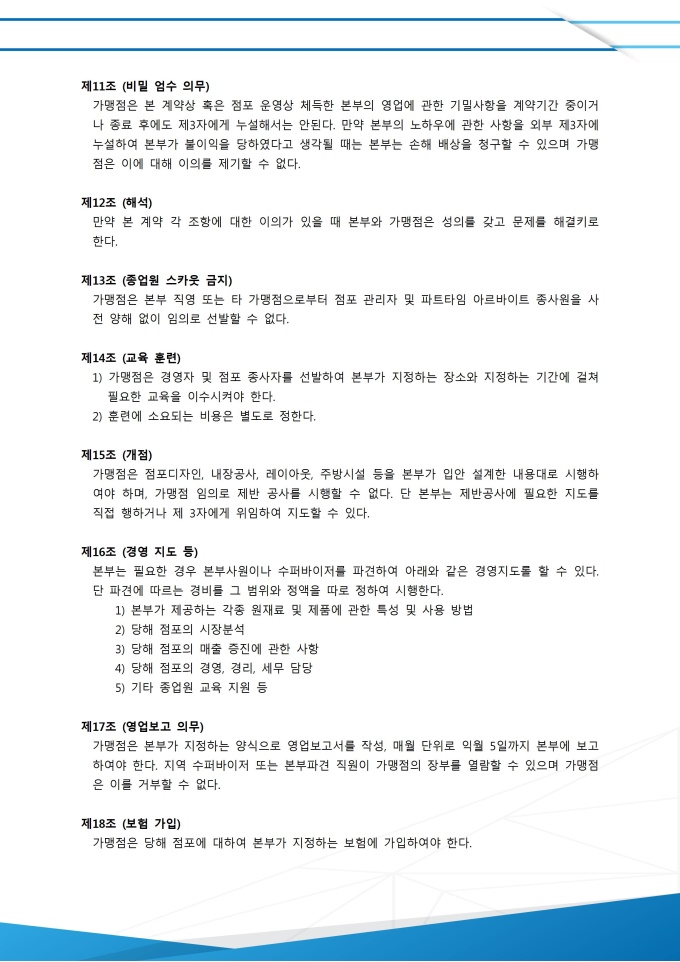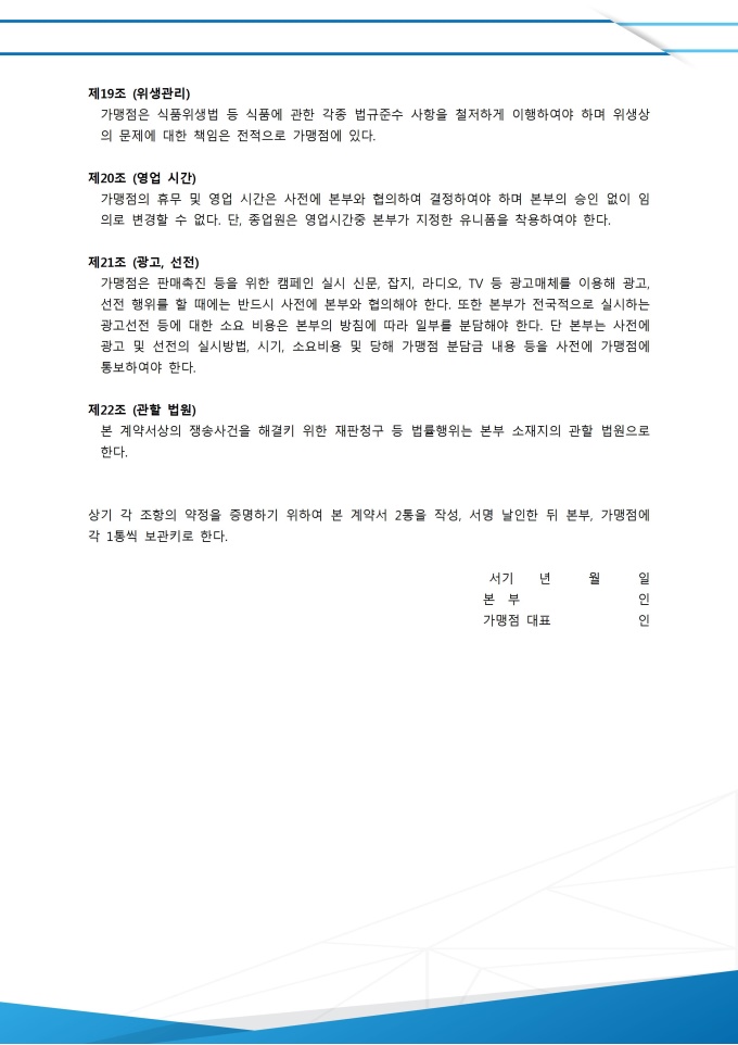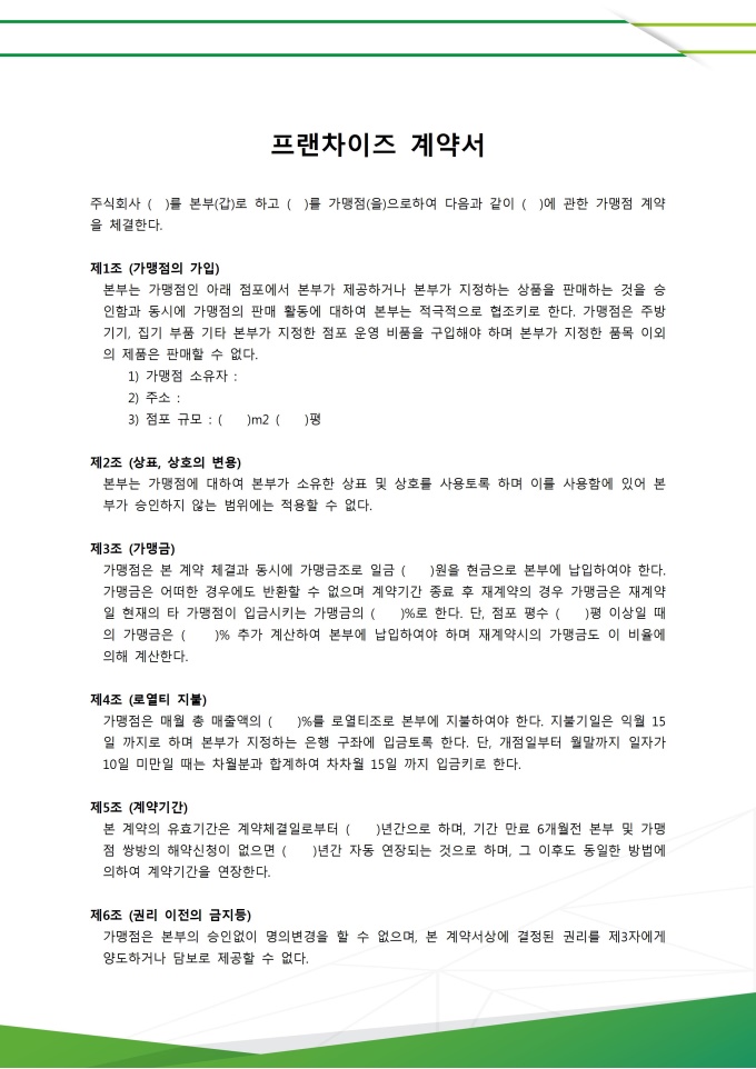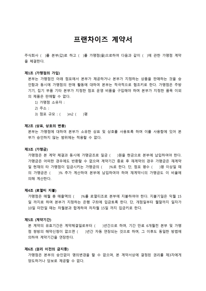 프랜차이즈 계약서 주식회사 ( )를 본부(갑)로 하고 ( )를 가맹점(을)으로하여 다음과 같이 ( )에 관한 가맹점 계약을 체결한다. 제 1조(가맹점의 가입) 본부는 가맹점인 아래 점포에서 본부가 제공하거나 본부가 지정하는 상품을 판매하는 것을 승인함과 동시에 가맹점의 판매 활동에 대하여 본부는 적극적으로 협조키로 한다. 가맹점은 주방 기기, 집기 부품 기타 본부가 지정한 점포 운영 비품을 구입해야 하며 본부가 지정한 품목 이외의 제품은 판매할 수 없다. 1) 가맹점 소유자 : 2) 주소 : ... ...