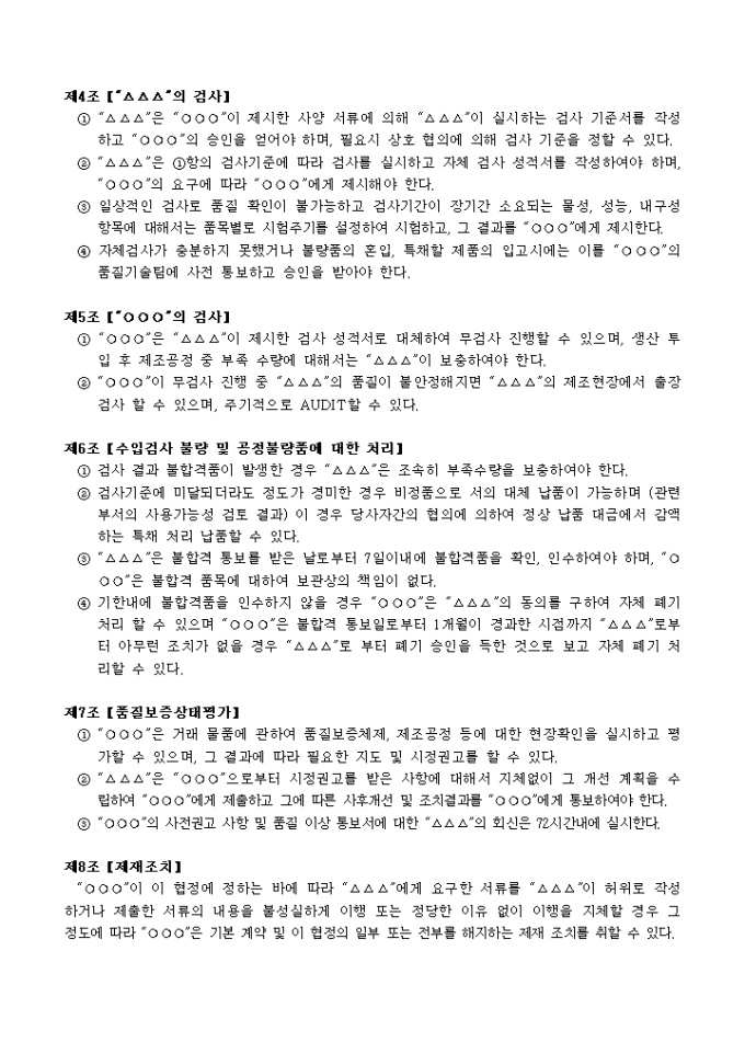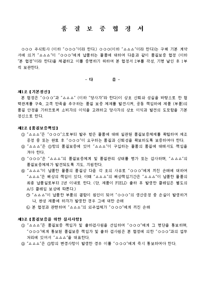 “갑”과 “을”은 물품 구매 공급 계약을 체결하고 쌍방이 원활한 구매 공급 체계를 확충하기 위해 규정해 놓은 물품구매 기본계약서이며, 품질보증협정서가 포함되어있습니다. 제1조【기본정신】