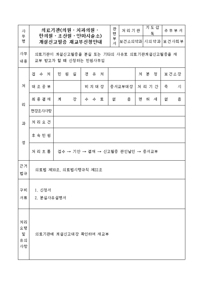의료기관(의원, 치과, 한의원, 조산원, 안마시술소)개설신고필증재교부신청서