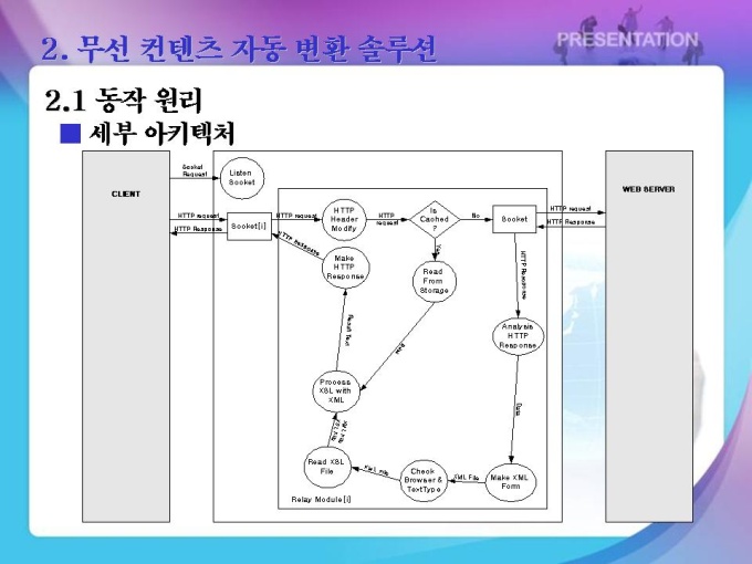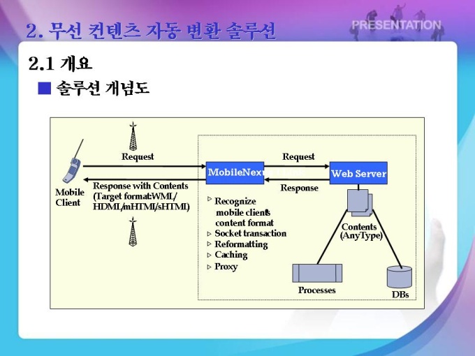 다양한 포맷의 혼재로 빚어지는 문제점에 대한 방안으로 별도의 무선 컨텐츠를 중심으로 자동 변환, 유선 컨텐츠와의 연동 가능, 무선의 특성을 최대한 활용할 수 있는 무선 컨텐츠 자동 변환 솔루션에 관한 제안서입니다. - 목 차 1. 솔루션 제안의 배경 1.1 무선 컨텐츠 구축 상의 문제점 1.2 기존의 변환 솔루션 2. 무선 컨텐츠 자동 변환 솔루션 2.1 개요 2.2 동작 원리 3. 솔루션 도입시의 장점