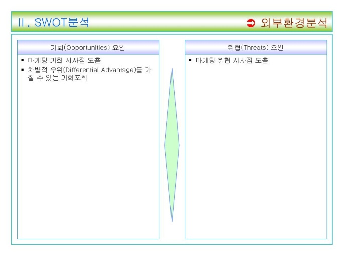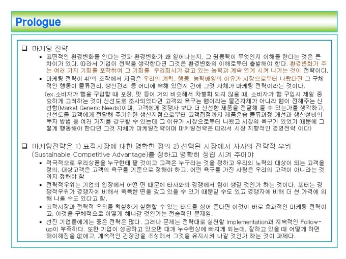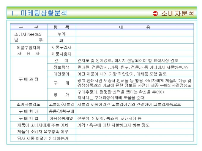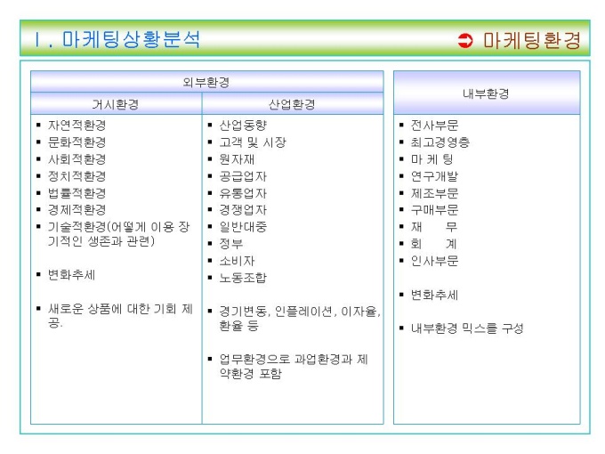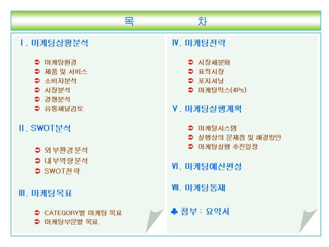 Ⅰ. 마케팅상황분석 마케팅환경 제품 및 서비스 소비자분석 시장분석 경쟁분석 유통채널검토 Ⅱ. SWOT분석 외부환경분석 내부역량분석 SWOT전략 Ⅲ. 마케팅목표 CATEGORY별 마케팅 목표 마케팅부문별 목표 Ⅳ. 마케팅전략 시장세분화 표적시장 포지셔닝 마케팅믹스(4Ps) Ⅴ. 마케팅실행계획 마케팅시스템 실행상의 문제점 및 해결방안 마케팅실행 추진일정 Ⅵ. 마케팅예산편성 Ⅶ. 마케팅통제 기획서 (마케팅_제조업) 예제입니다.