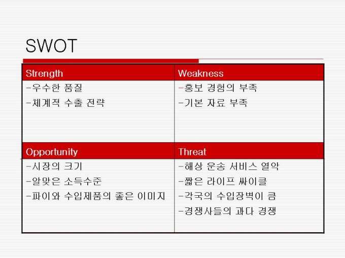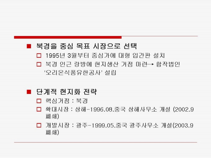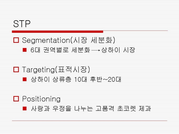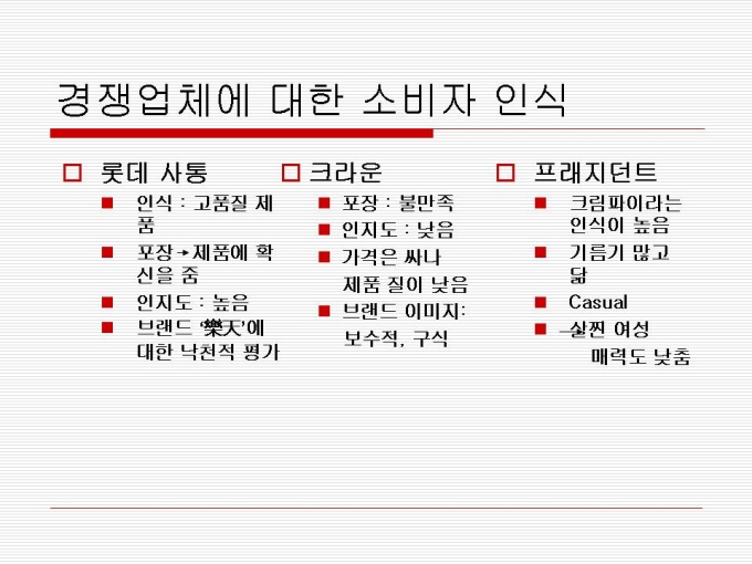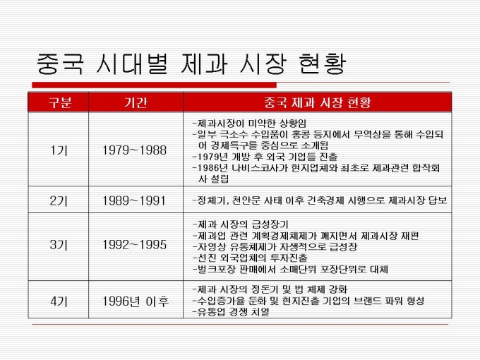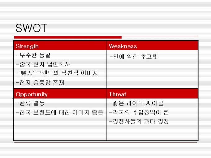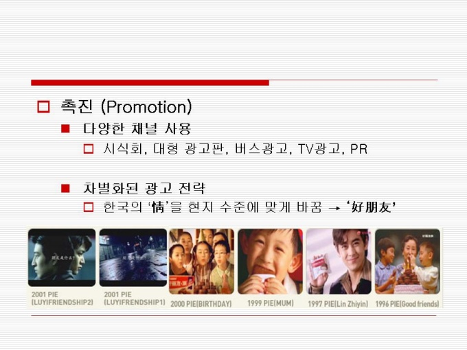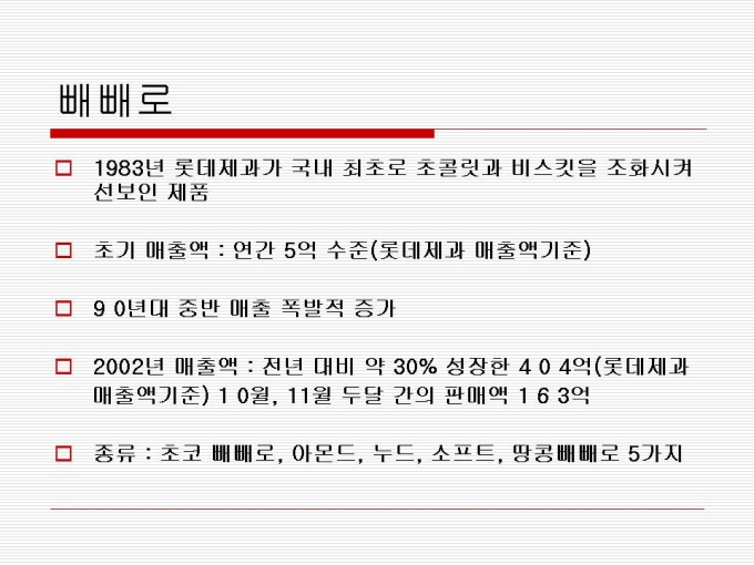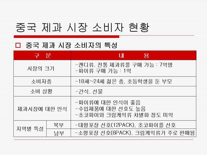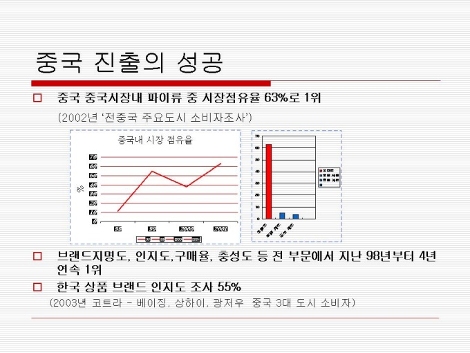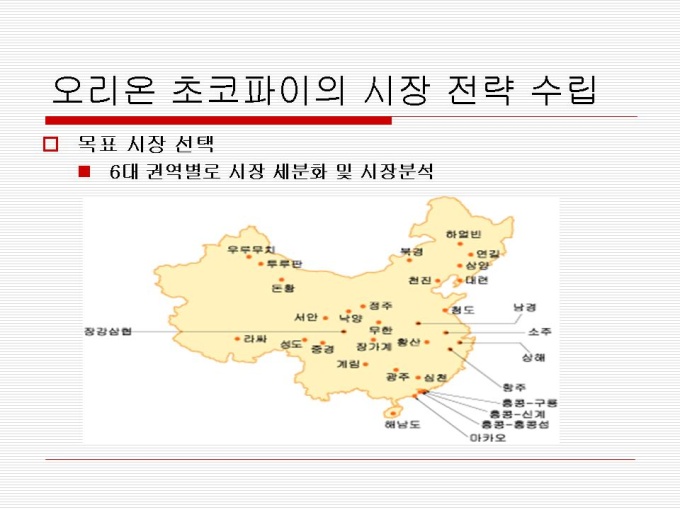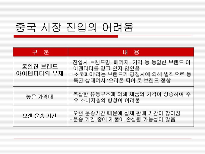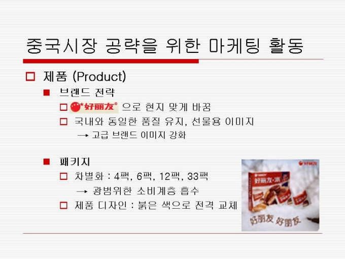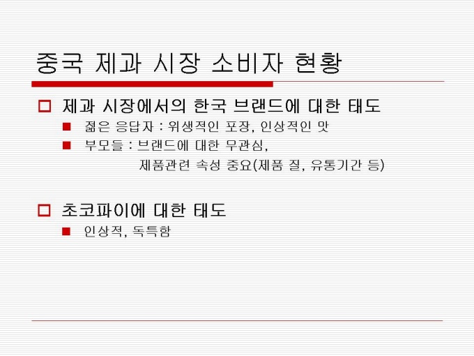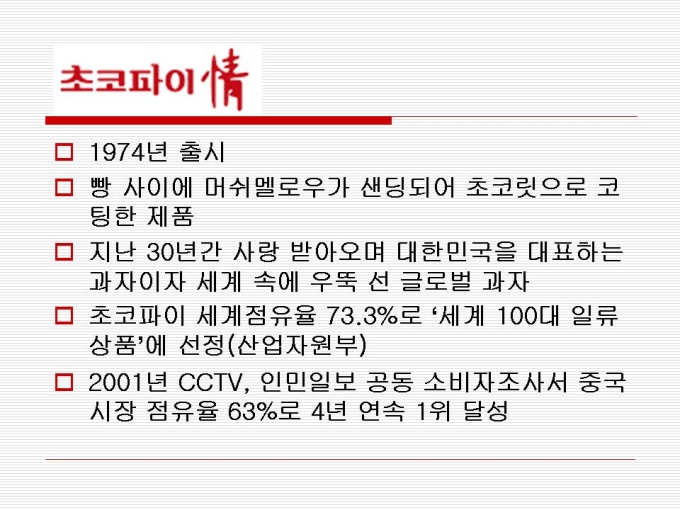 1974년 출시 빵 사이에 머쉬멜로우가 샌딩되어 초코릿으로 코팅한 제품 지난 30년간 사랑 받아오며 대한민국을 대표하는 과자이자 세계 속에 우뚝 선 글로벌 과자 초코파이 세계점유율 73.3%로 ‘세계 100대 일류 상품’에 선정(산업자원부) 2001년 CCTV, 인민일보 공동 소비자조사서 중국시장 점유율 63%로 4년 연속 1위 달성 프리젠테이션 자료 (경영_국제마케팅) 입니다.