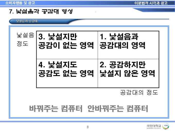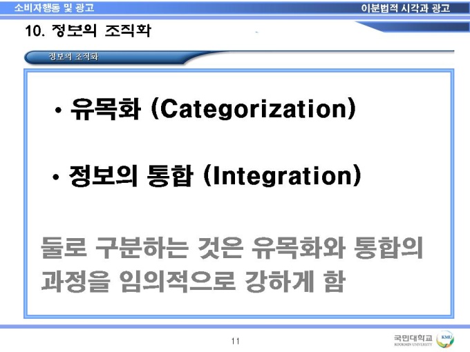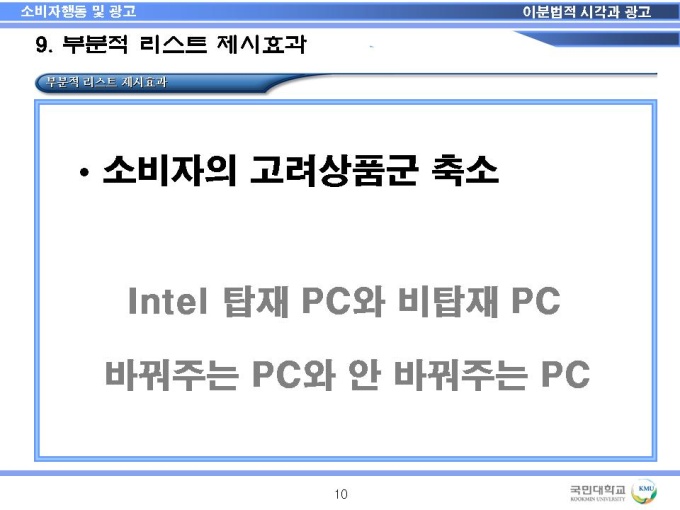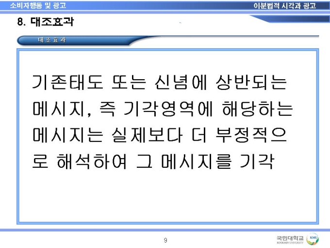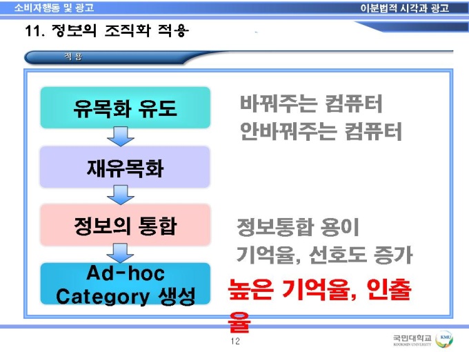 1. 소재 선택 이유 2. 서론 3. 상반된 개념들 4. 기업의 마케팅 방향 5. 해외 사례 6. 국내 사례 7. 낯설음과 공감대 형성 8. 대조효과 9. 부분적 리스트 제시효과 10. 정보의 조직화 11. 정보의 조직화 적용 프리젠테이션 자료 (광고_소비자행동) 입니다.