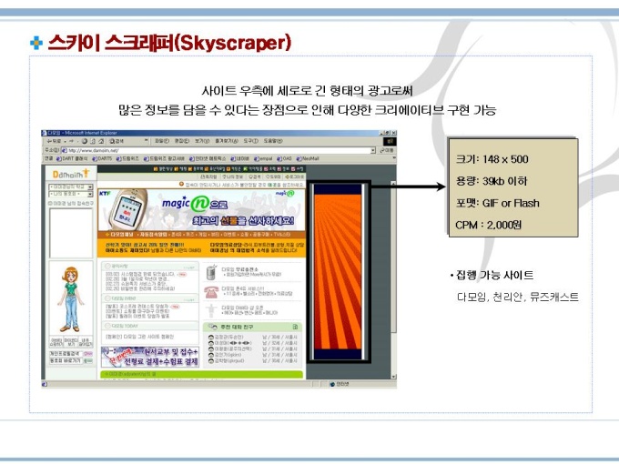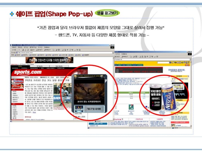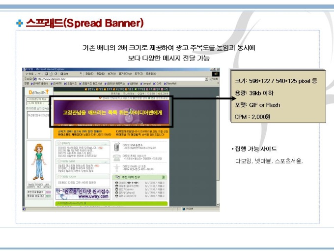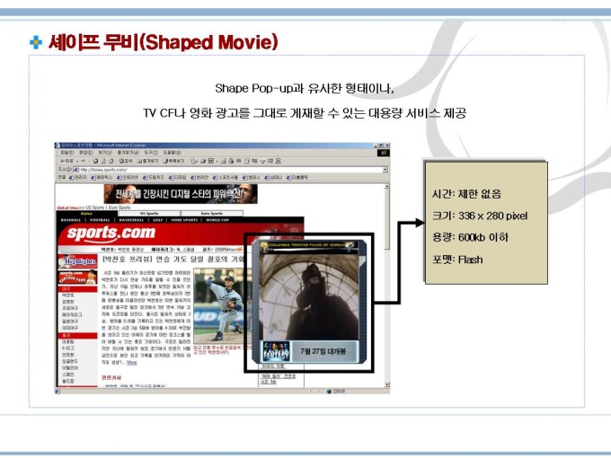 스프래드(Spread Banner) 스카이 스크래퍼(Skyscraper) 팝업(Pop-up) 와이드(Wide AD) 셰이프 무비(Shaped Movie) 쉐이프 팝업(Shape Pop-up) 프리젠테이션 자료 (광고_인터넷) 입니다.
