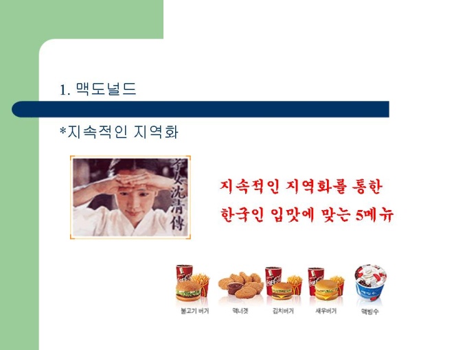 1. 맥도날드 * 맥도날드 소개 * 한국 맥도날드 * 지속적인 지역화 * 가족을 위한 공간 2. QSC&V 3. People Promise 4. Menu 프리젠테이션 자료 (경영_외식사업_맥도널드) 입니다.
