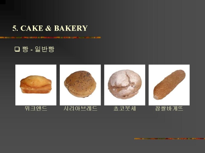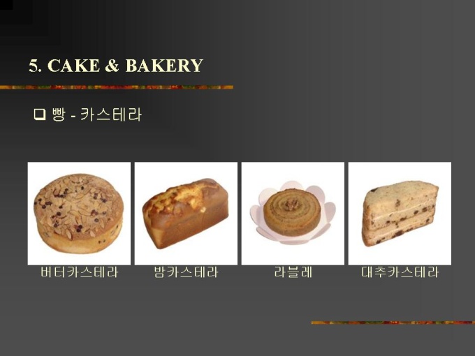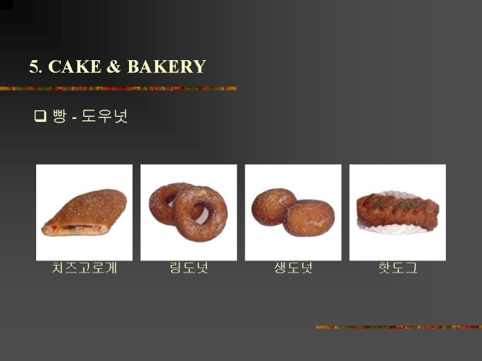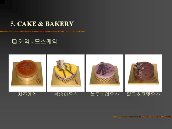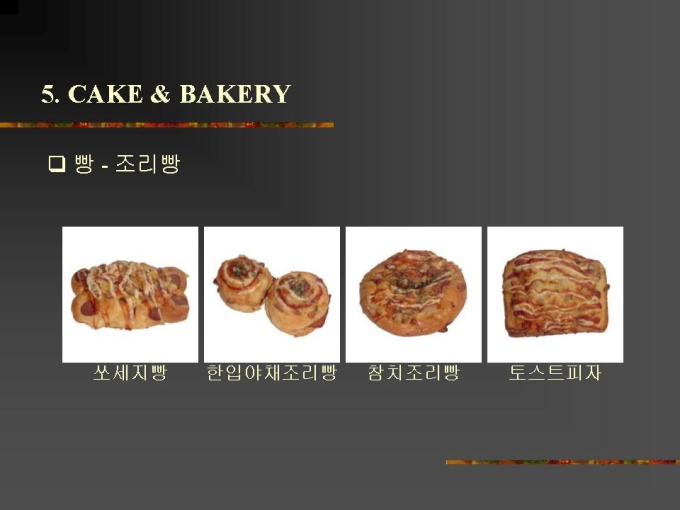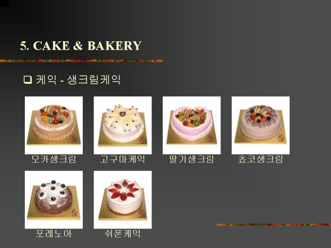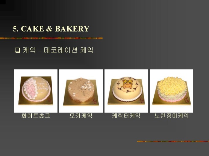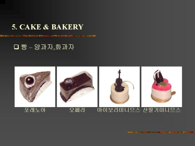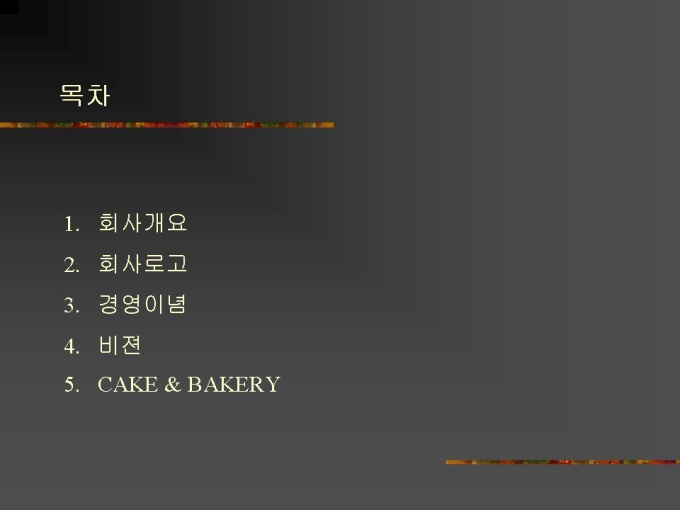 1.회사개요 2.회사로고 3.경영이념 4.비젼 5.CAKE & BAKERY 프리젠테이션 자료 (경영_외식사업_풍년제과) 입니다.