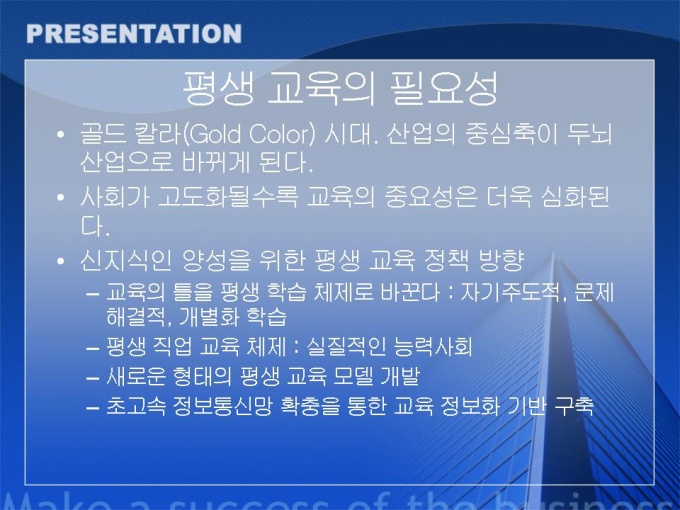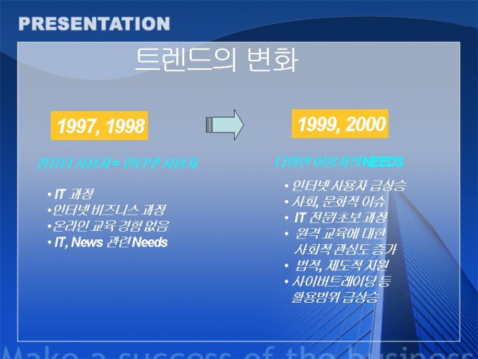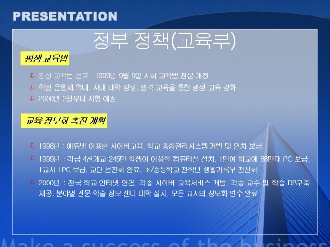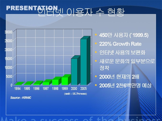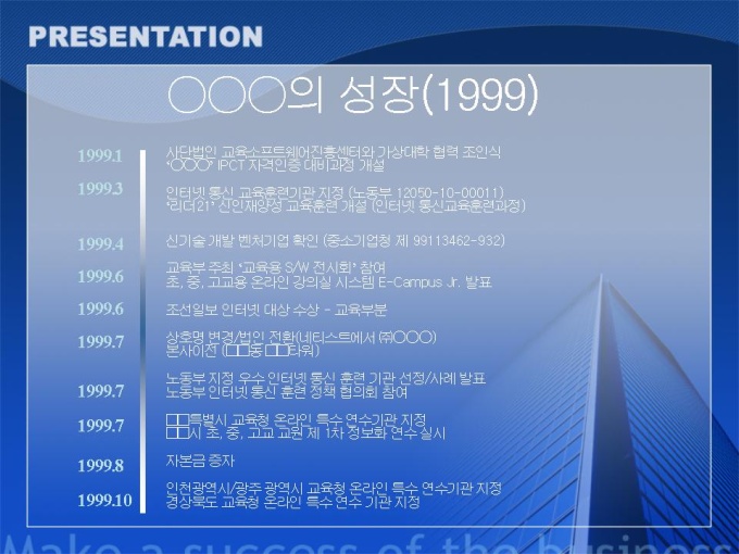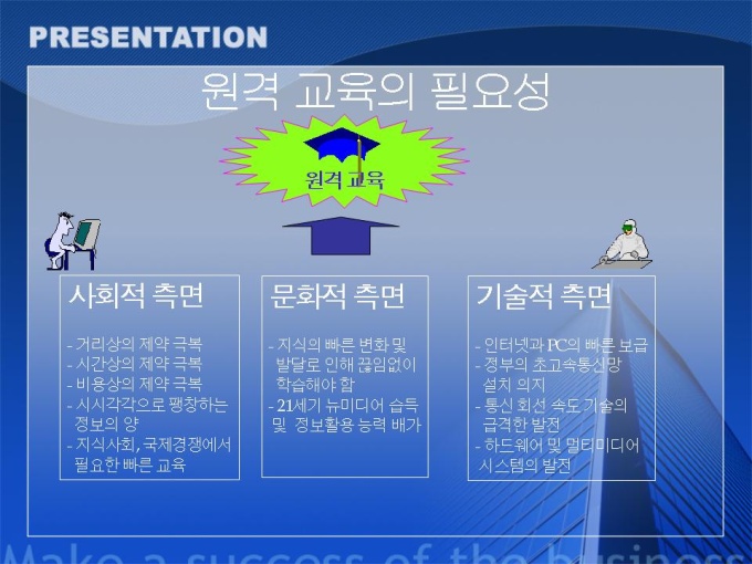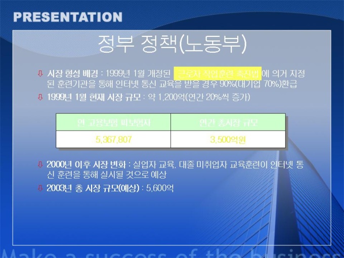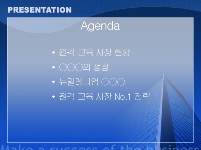 원격 통신교육에 관한 소프트웨어 개발 판매 사업계획서입니다. 자세한 내용은 아래의 목차를 참고하세요. -목차- I. 원격 교육 시장 현황 1.평생 교육의 필요성 2.원격 교육의 필요성 3.정부 정책(노동부) 4.정부 정책(정보통신부) 5.정부 정책(교육부) 6.인터넷 이용자 수 현황 7.국내 온라인 교육 시장 8.교육 솔루션 판매 시장 현황 9.원격 교육 수요의 증가 II. 회사의 성장 1.회사소개 2.회사 성장과정 III. 뉴밀레니엄 ○○○