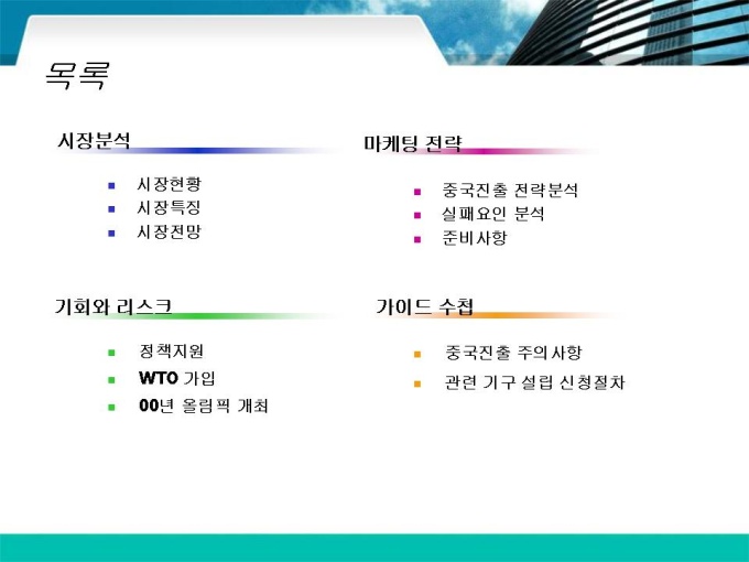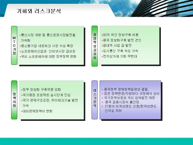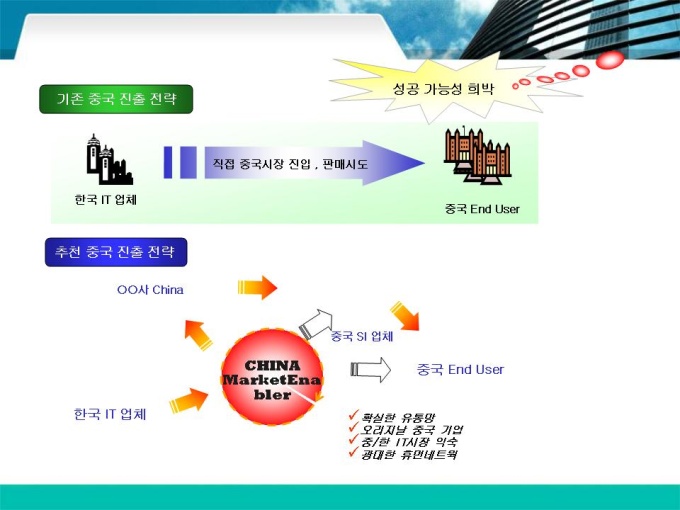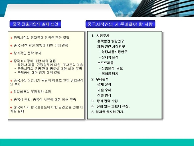 중국진출 컴퓨터 소프트웨어 마케팅 개발 판매에 관한 사업계획서입니다. 자세한 내용은 다음의 목차를 참고하세요. -목차- 1.시장분석 -시장현황 -시장특징 -시장전망 2.마케팅 전략 -중국진출 전략분석 -실패요인 분석 -준비사항 3.기회와 리스크 -정책지원 -WTO 가입 -2008년 올림픽 개최 4.가이드 수첩 -중국진출 주의사항 -관련 기구 설립 신청절차