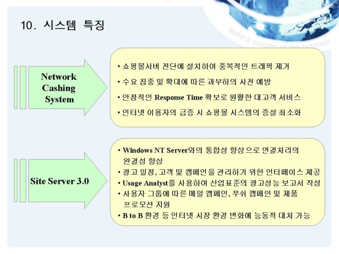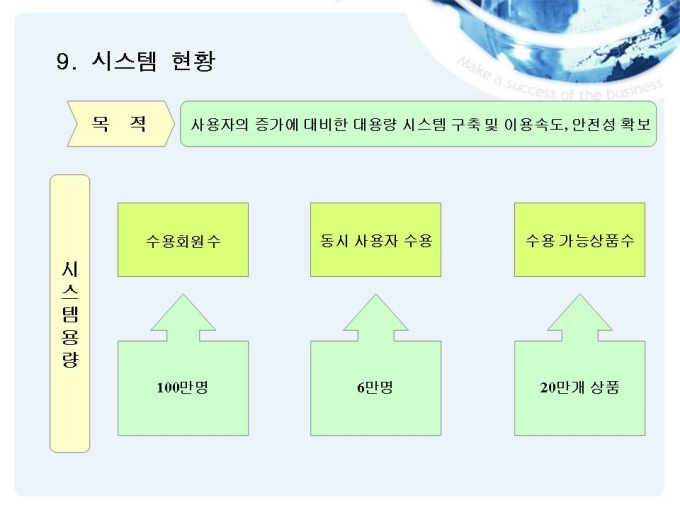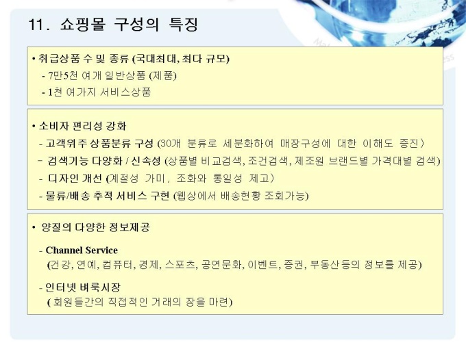 쇼핑 및 종합 생활 편의 서비스를 제공하는 회사의 사업소개를 위한 제안서입니다. - 목 차 1.인터넷 쇼핑몰 현황 2.기본 전략 3.EC 사업전략 4.운영전략 5.성공 전략 6.운영성과 7.고객 만족 정책 8.협력사와의 협력 관계 9.시스템 현황 10.시스템 특징 11.쇼핑몰 구성의 특징 12.업무 프로세스의 혁신