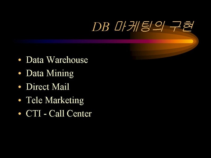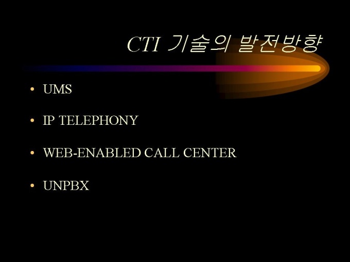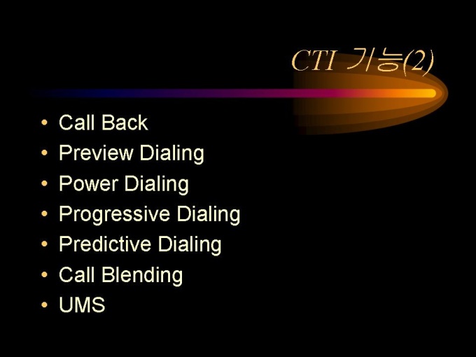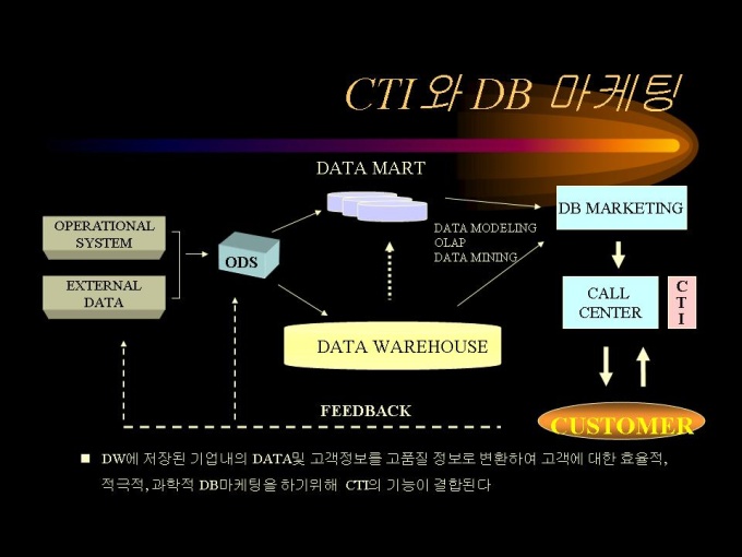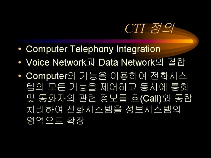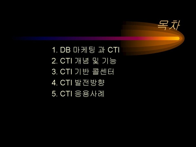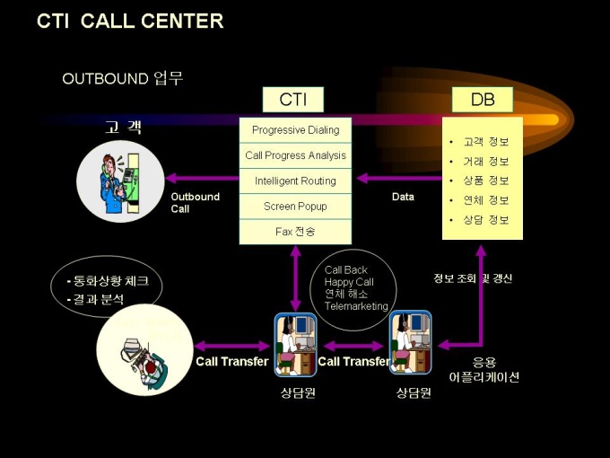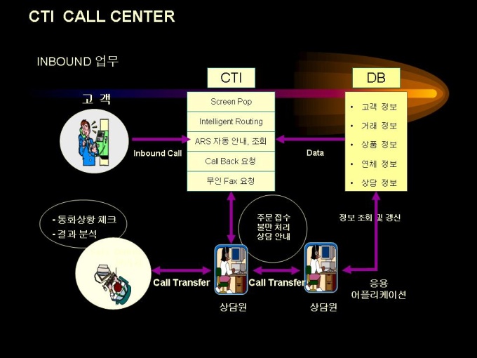 Computer의 기능을 이용하여 전화시스템의 모든 기능을 제어하고 동시에 통화 및 통화자의 관련 정보를 호(Call)와 통합 처리하여 전화시스템을 정보시스템의 영역으로 확장 하기 위한 DB 마케팅을 위한 CTI솔루션 구현 제안서입니다. - 목 차 1. DB 마케팅 과 CTI 2. CTI 개념 및 기능 3. CTI 기반 콜센터 4. CTI 발전방향 5. CTI 응용사례
