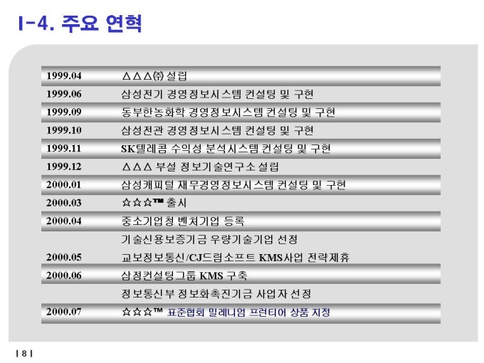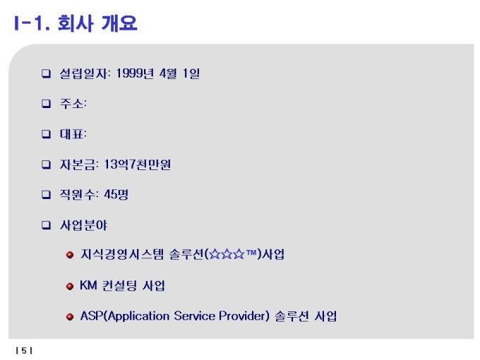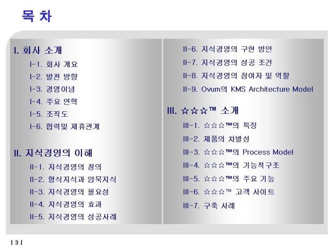 지식경영시스템 솔루션 KM컨설팅 ASP 경영,개발에 대한 사업계획서입니다. 자세한 내용은 다음의 목차를 참고하세요. -목차- I. 회사 소개 I-1. 회사 개요 I-2. 발전 방향 I-3. 경영이념 I-4. 주요 연혁 I-5. 조직도 I-6. 협력및 제휴관계 II. 지식경영의 이해 II-1. 지식경영의 정의 II-2. 형식지식과 암묵지식 II-3. 지식경영의 필요성 II-4. 지식경영의 효과 II-5. 지식경영의 성공사례 II-6. 지식경영의 구현 방안 II-7. 지식경영의 성공 조건 II-8. 지식경영의 참여자 및 역할 II-9. Ovum의 KMS Architecture Model III. ☆☆☆™ 소개 III-1. ☆☆☆™의 특징 III-2. 제품의 차별성 III-3. ☆☆☆™의 Process Model III-4. ☆☆☆™의 기능적구조 III-5. ☆☆☆™의 주요 기능 III-6. ☆☆☆™ 고객 사이트 III-7. 구축 사례