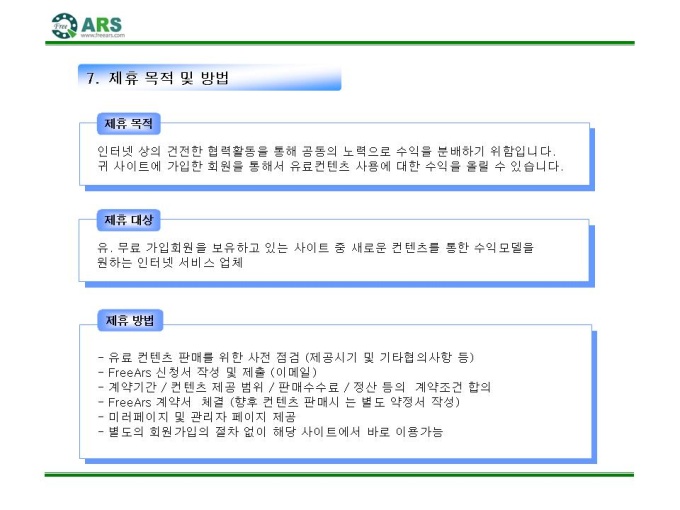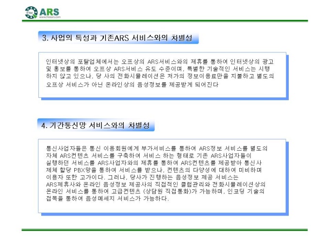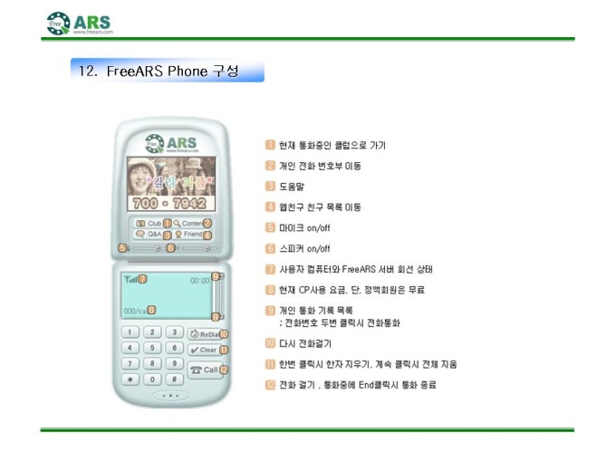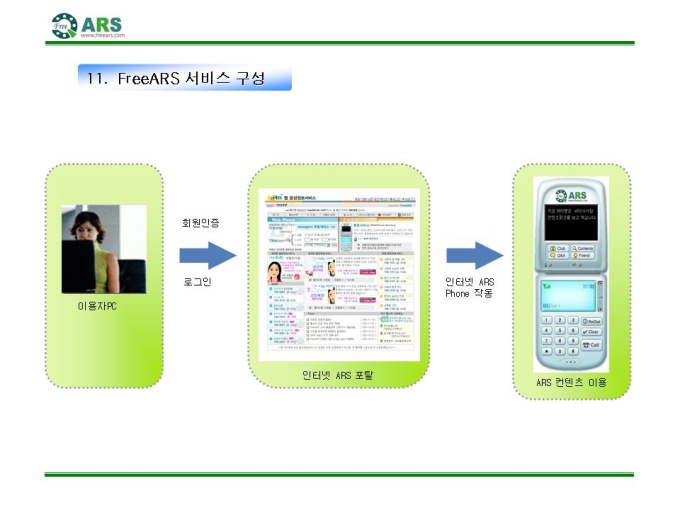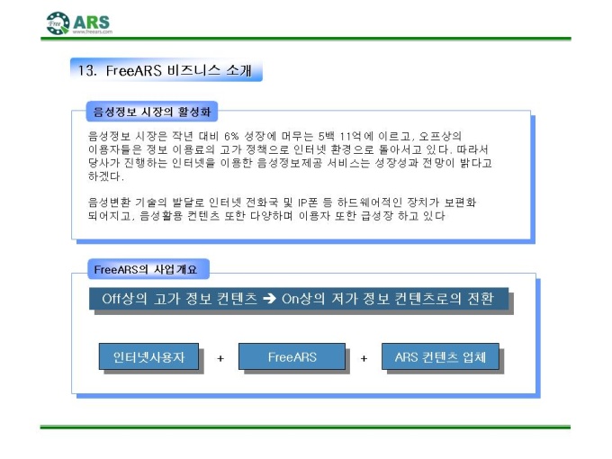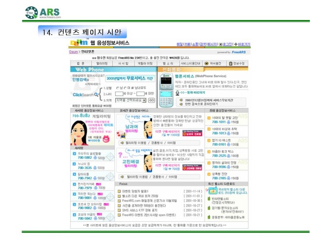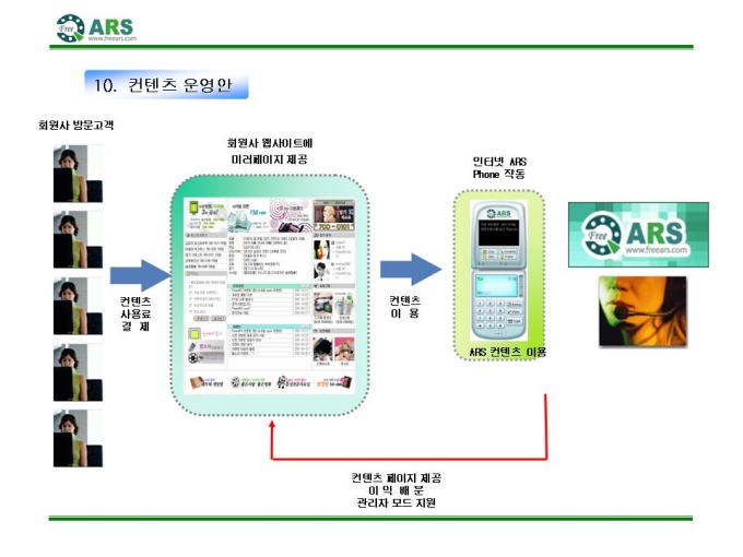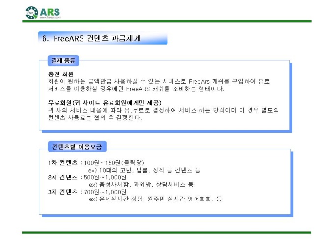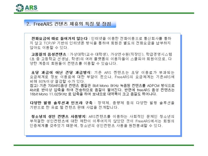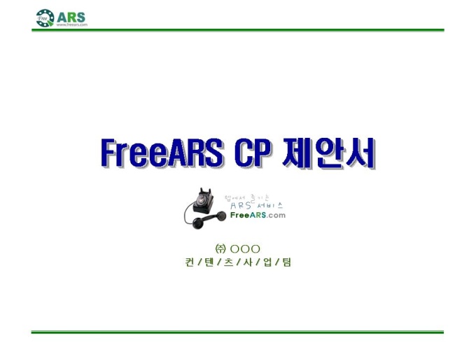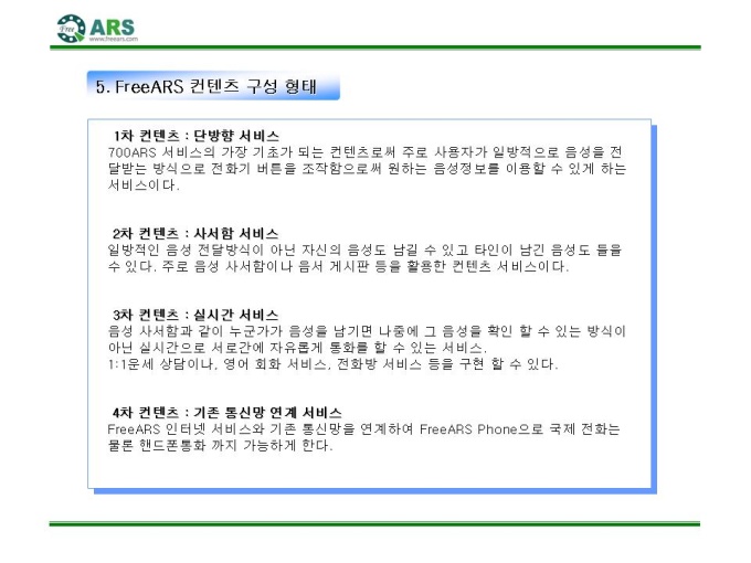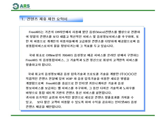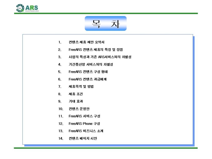 인터넷ARS 음성 컨텐츠 제공 제안서입니다. - 목 차 1.컨텐츠 제휴 제안 요약서 2.FreeARS 컨텐츠 제휴의 특징 및 장점 3.사업의 특성과 기존 ARS서비스와의 차별성 4.기간통신망 서비스와의 차별성 5.FreeARS 컨텐츠 구성 형태 6.FreeARS 컨텐츠 과금체계 7.제휴목적 및 방법 8.제휴 조건 9.기대 효과 10.컨텐츠 운영안 11.FreeARS 서비스 구성 12.FreeARS Phone 구성 13.FreeARS 비즈니스 소개 14.컨텐츠 페이지 시안