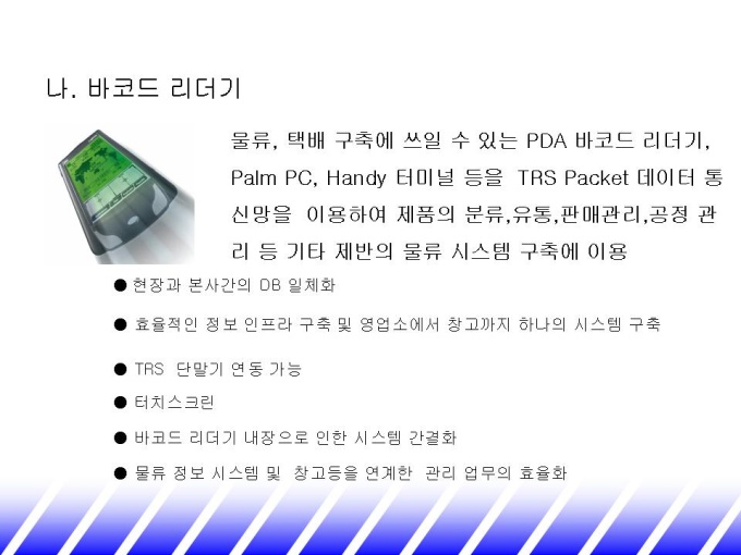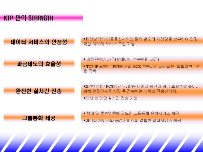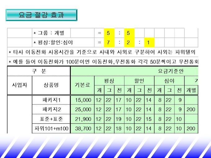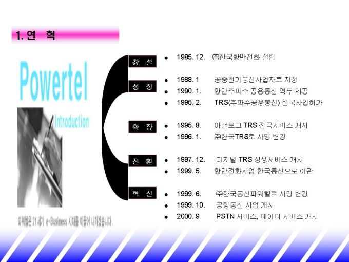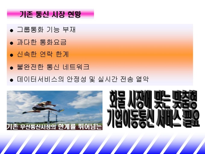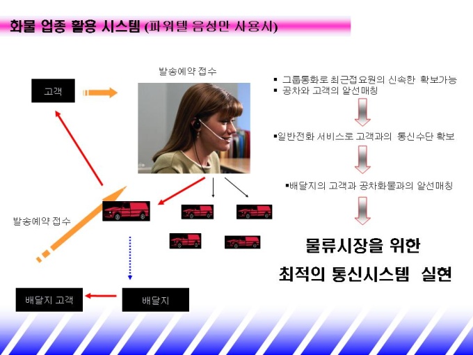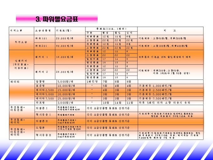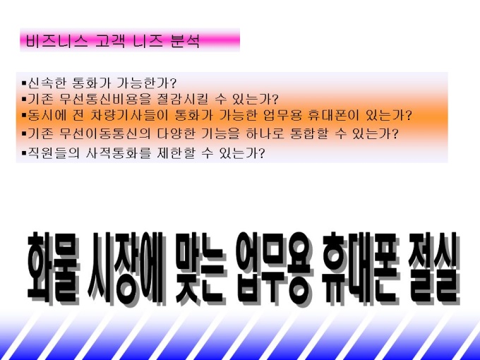 화물 시장에 맞는 업무용 휴대폰을 소개하는 제안서입니다. - 목 차 1.기존 통신 시장 현황 -비즈니스 고객 니즈 분석 -기존 통신 시장 현황 2.파워텔 solution -STRENGTH -멀티 서비스 -화물 업종 활용 시스템 3.파워텔 도입 효과 -요금 절감 효과 -업무효율 제고 효과 4.회사 및 제품 소개 -연 혁 -단말기 종류 및 가격 -파워텔요금표 -활용업체