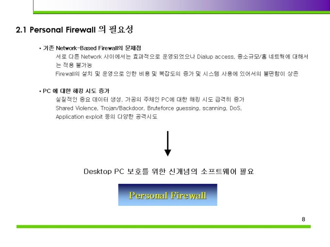 해킹/침입 차단 솔루션 제안서입니다. - 목 차 1.제안사 소개 -일반 현황 -회사 연혁 2.Personal Firewall -Personal Firewall 의 필요성 -Personal Firewall 시장의 성장 가능성 -Customer Benefits 3.SWIM/PIM SDK 솔루션 -SWIM SDK -구성도 -PIM SDK -Comparison with LSP -Specification -납품 내역 -Sample Code 4.도입효과 5.Business Process