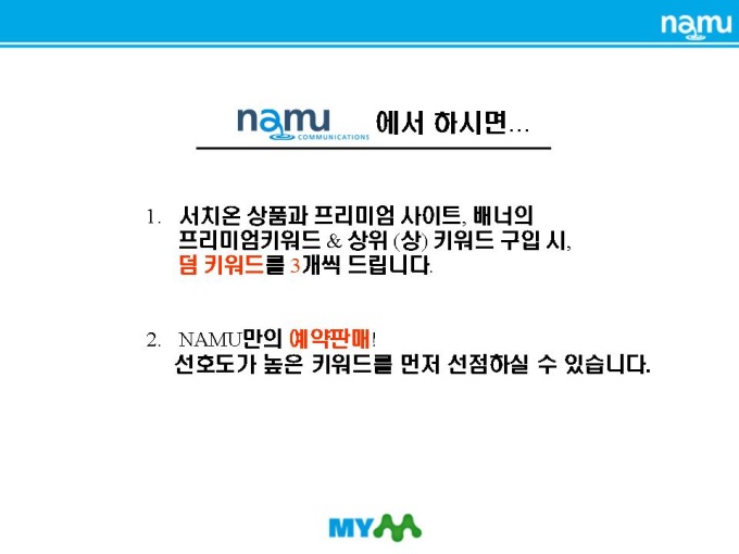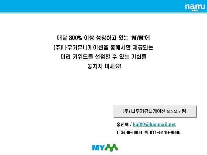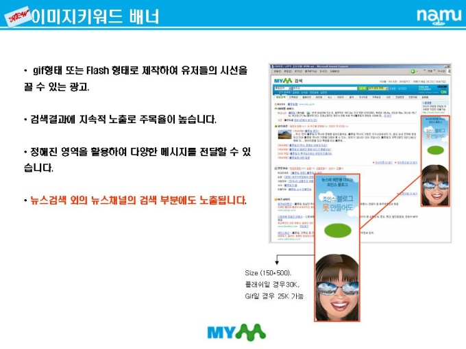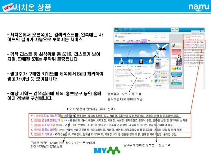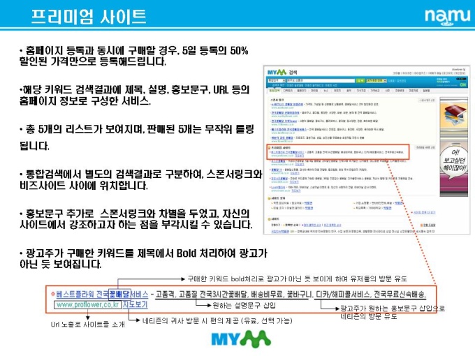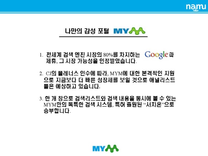 1. 전세계 검색 엔진 시장의 80%를 차지하는 ○○○과 제휴, 그 시장 가능성을 인정받았습니다. 2. CJ의 플레너스 인수에 따라, MYM에 대한 본격적인 지원으로 지금보다 더 빠른 성장세를 보일 것으로 애널리스트들은 예상하고 있습니다. 3. 한 개 창으로 검색리스트와 검색 내용을 동시에 볼 수 있는 MYM만의 독특한 검색 시스템, 특허 출원된 “서치온”으로 승부합니다. 제안서 (웹사이트_광고1) 예제 양식입니다.