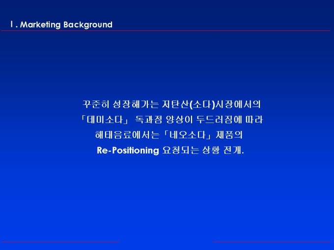 Ⅰ. Marketing Background Ⅱ. Re-Positioning을 위한 경쟁브랜드 점검 Ⅲ. Re-Positioning의 기본 전제 Ⅳ. Marketing Strategy Ⅴ. Communication Strategy Ⅵ. Campaign Result Ⅶ. 향후 Communication 전개방안 제안서 (마케팅_음료) 양식입니다.