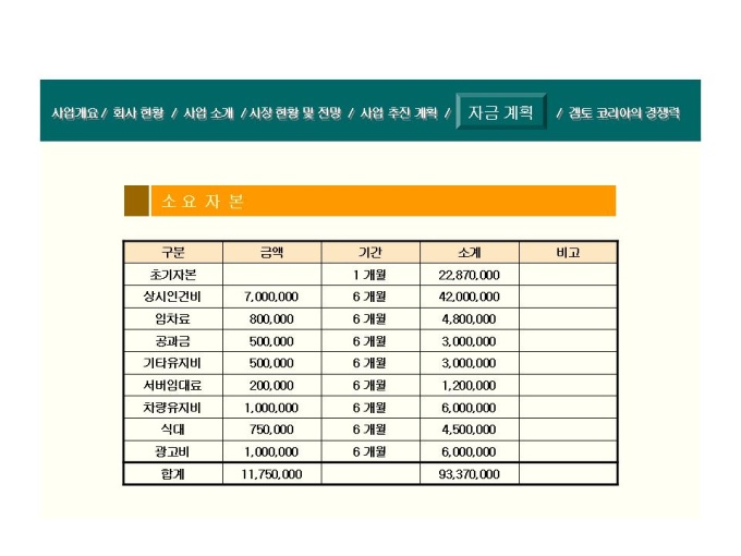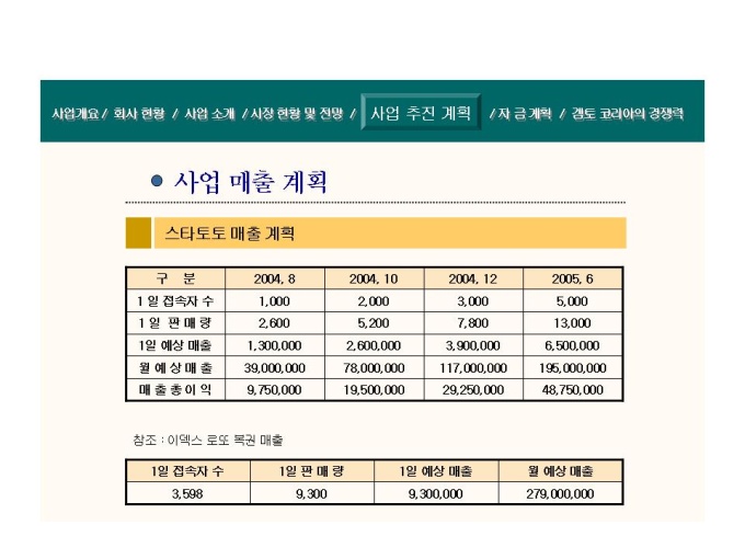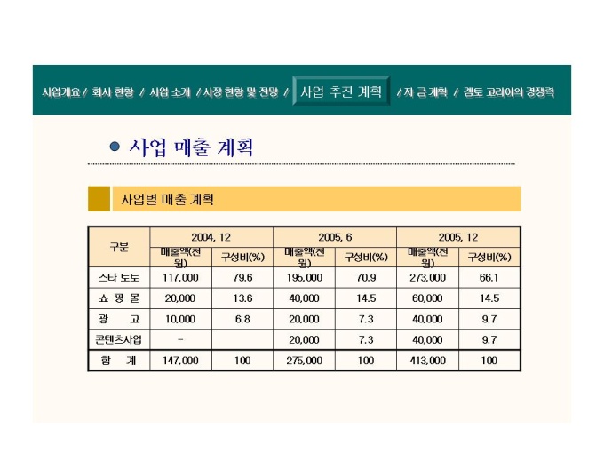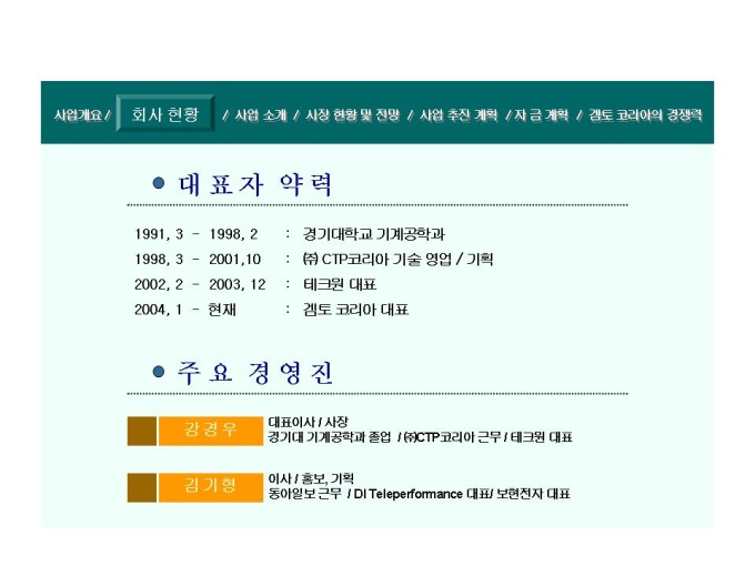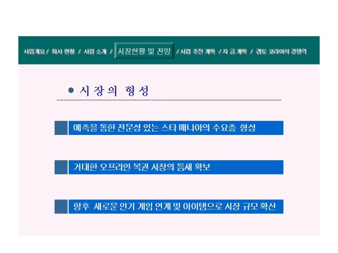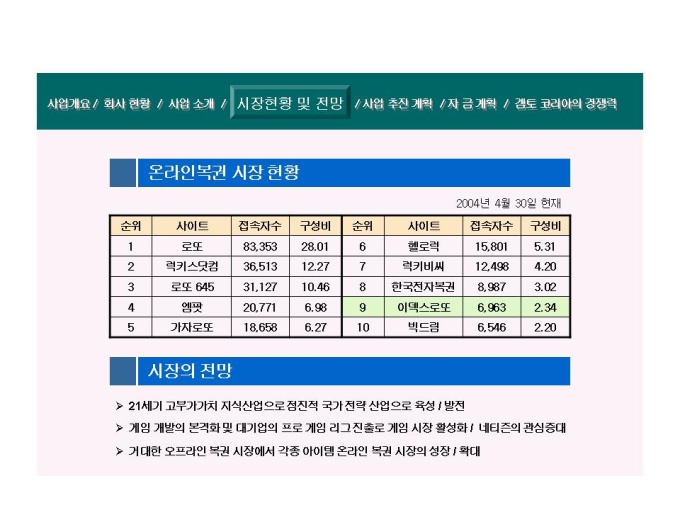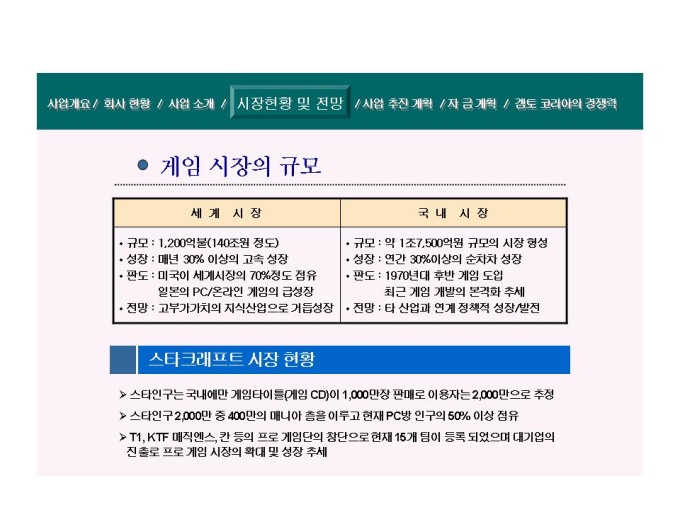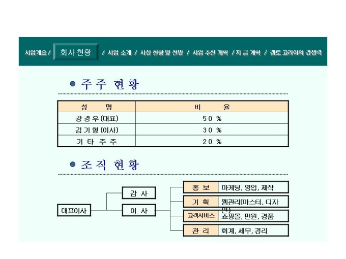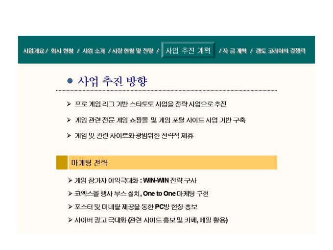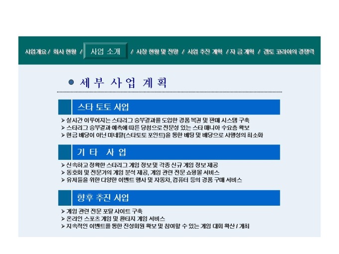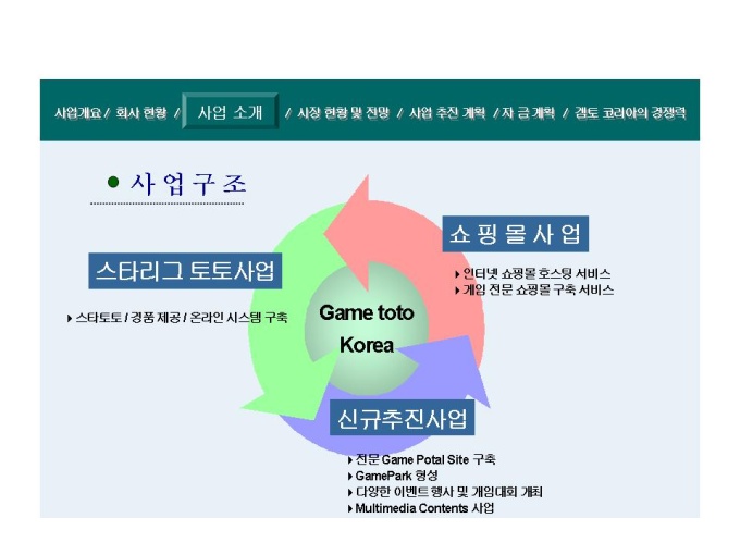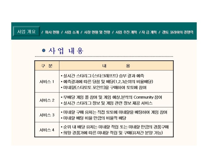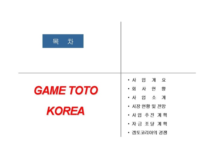 회사소개서 (웹사이트_게임) 1. 사업개요 2. 회사현황 3. 사업소개 4. 시장 현황 및 전망 5. 사업 추진계획 6. 자금 조달계획 7. 겜토코리아의 경쟁