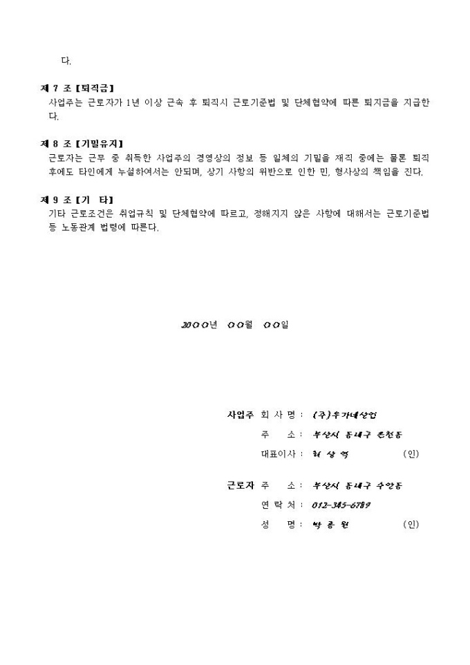 정규직 사원을 채용할 경우 사용할 수 있는 근로계약서로써 9개의계약조항으로 구성되어있습니다. 간단한 샘플을 포함하고 있습니다. 제 1 조【계약기간】