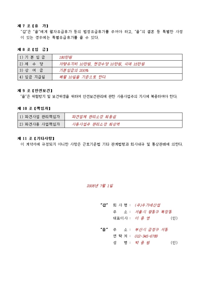 고용업체에서 파견근로자를 고용할 때 사용하는 고용계약서로써 11개의 계약조항으로 구성되어 있습니다. 제 1 조【파견기간】