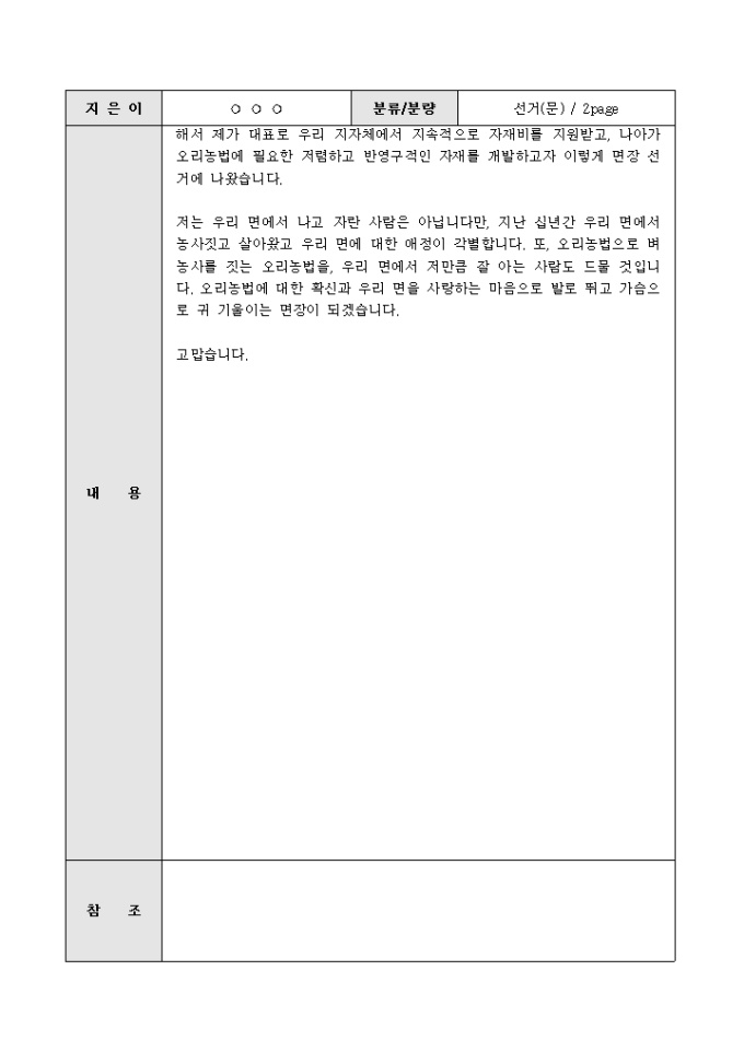 면장선거연설문(오리농법에 대한 확신과 애향심으로 면을 이끌겠다는 약속)