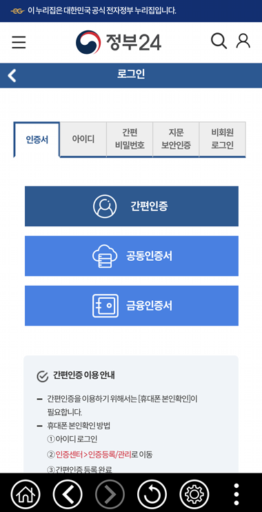 정부 24앱 통해서만 가능하며 PC환경에서는 참여 불가합니다. 로그인 후 참여할 수 있는데요. 간편인증, 공동인증서, 금융인증서 등을 통해 로그인이 가능합니다. 간편인증을 위해서는 휴대폰 본인확인이 필요하고, 공동인증서를 통해 로그인을 하려면 공동인증서를 가져와 등록 후 이용할 수 있습니다.