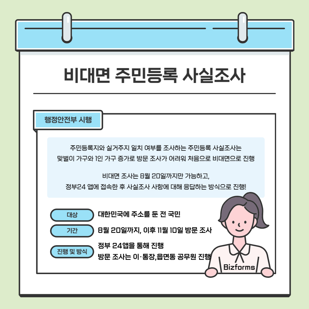 주민등록 사실조사는 주민등록상 등재된 사항과 실제 거주사실을 일치시켜 주민 생활의 편익을 증진시키고 행정기관의 효율적인 행정업무를 지원하기 위함인데요. 해당 조사는 무단 전출자, 거주지 변동 후 미신고자 등이 발견되면 가족 및 주민들에게 그 사실을 알리고 주민등록 현황을 바로 잡고 안내를 할 예정이라고 합니다.