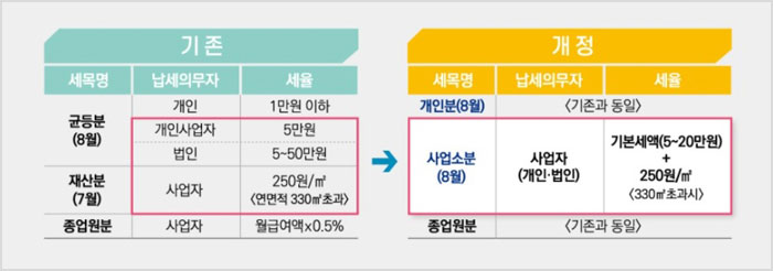 이전까지는 주민세 ‘재산분’이라는 이름의 세목과 ‘균등분’이라는 이름의 세목으로 개인과 법인이 구분되어 세금을 납부해 왔었는데 2021년부터는 일부 개정을 거쳐 사업소분이라는 이름으로 개인사업자 및 법인이 사업장 소재지에 따라 세금을 납부하는 걸로 변경되었습니다.