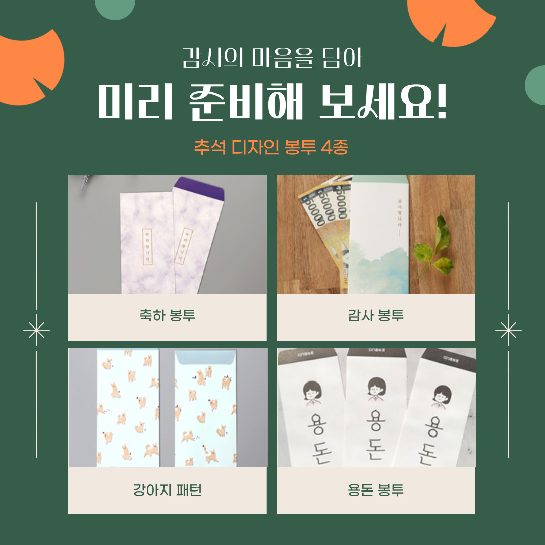 명절엔 한우나 과일 등 선물세트뿐만 아니라 상여금이나 현금 선물을 하게 되는 경우가 많습니다. 그럴 경우 흔하게 볼 수 있는 하얀 봉투가 아니라 정성스러운 디자인 봉투로 감사의 의미를 좀 더 표현하는 것도 하나의 방법입니다.