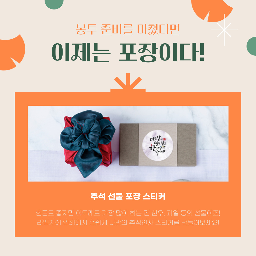 그럴 때 봉투처럼 포장에도 좀 더 신경 쓴다면 좋아 보입니다. 추석 인사말이 담겨 있는 스티커에 회사 로고나 이름을 넣어주면 누가 준 것인지 확실하게 어필할 수 있죠! 그래서 많은 분들이 스티커를 따로 제작하기도 하고 구매를 하기도 합니다.