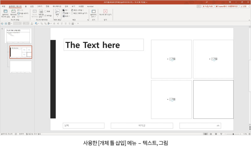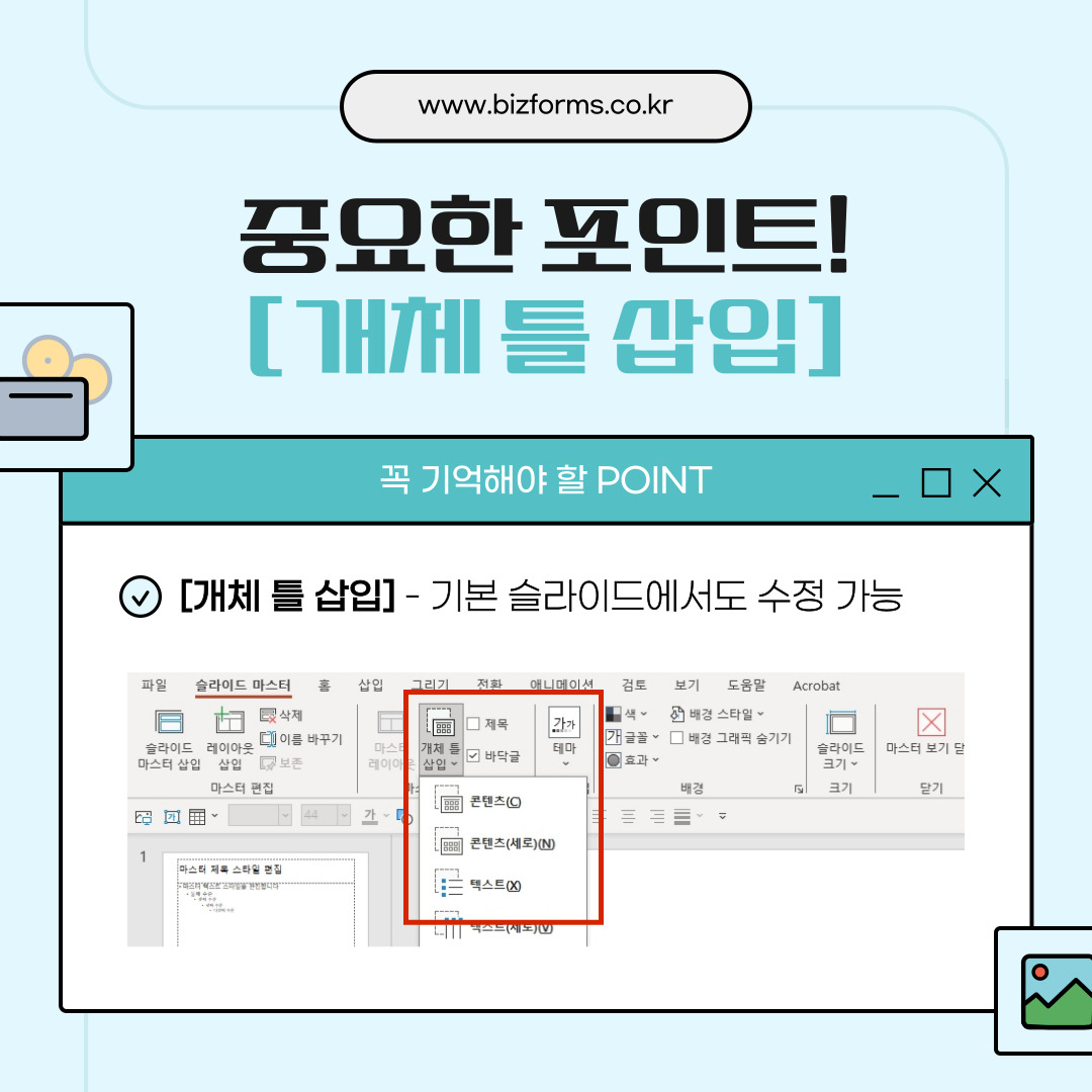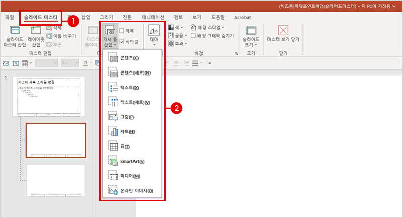 1️⃣ [슬라이드 마스터] – [개체 틀 삽입] 선택
