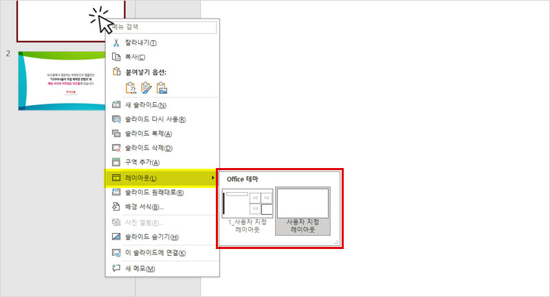 4️⃣ 적용하고 싶은 슬라이드 오른쪽 클릭 – [레이아웃] 선택 – 원하는 슬라이드 마스터 선택