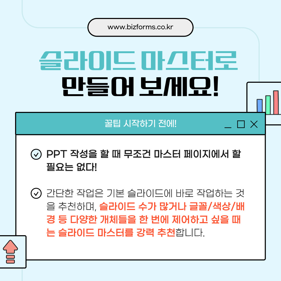 슬라이드 마스터라고 해서 엄청 어렵거나 복잡한 건 아닙니다. 평소 PPT 작성을 해보신 분이라면 슬라이드 마스터 작업도 어렵지 않게 하실 수 있습니다. 저와 같이 만들어보면서 슬라이드 마스터를 경험해 보세요!