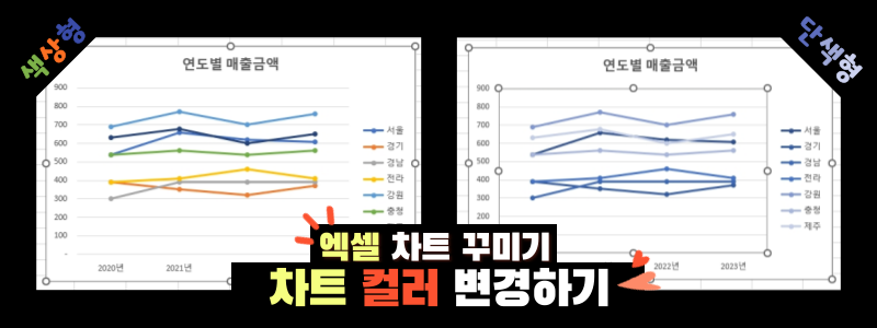 차트에 표시되는 데이터가 많을 때 선이나 막대의 컬러를 하나씩 클릭해서 변경하기는 어렵죠. 또한 내가 변경한 그래프의 컬러 조합이 오히려 데이터의 가시성을 떨어트릴 수도 있는데요. 이럴 때 유용하게 사용할 수 있는 차트 디자인 [색 변경] 기능에 대해 알아보겠습니다❗
