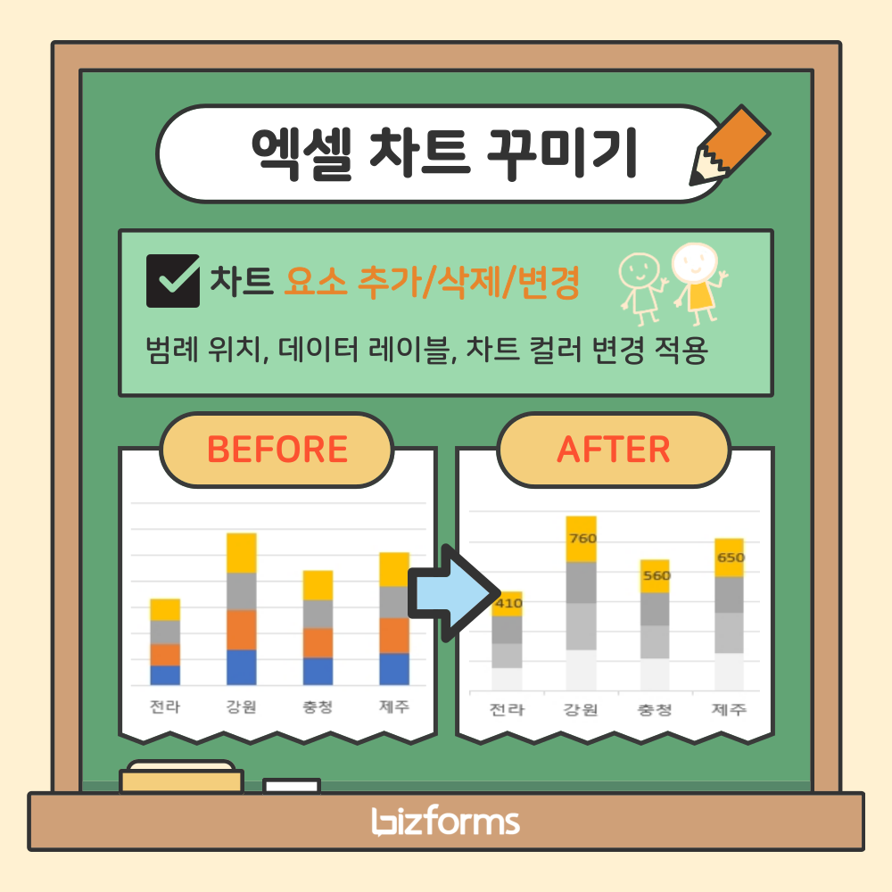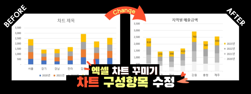 엑셀에서 생성되는 기본차트는 일반적으로 많이 사용하는 차트 항목만 표시합니다. 하지만 이러한 차트 항목이 추가로 필요하거나 혹은 필요하지 않는 경우가 발생할 수 있죠🤷♀️? 필요하지 않는 부분은 과감하게 없애 주고, 필요한 요소라도 위치를 조금씩 변경해 준다면 훨씬 보기 좋은 차트로 바뀌게 됩니다.
