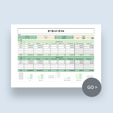 분기별 KPI 분석표 엑셀 데이터 서식입니다. 작성자, 전년도 해당분기 수익, 고객 수, 당해연도 해당분기 수익, 고객 수 등으로 구성되어 있습니다.