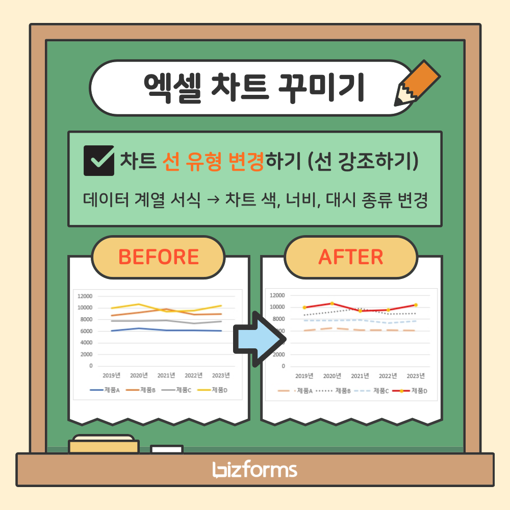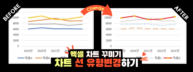 기본적으로 생성되는 선 차트도 계열별로 컬러가 다르게 설정되어 데이터를 분석하기 편하도록 추출됩니다. 하지만 특정한 계열의 값을 더 눈에 띄게 만들고 싶다면 어떻게 해야 할까요? 바로 선의 두께와 컬러 등을 조정해야 합니다❗