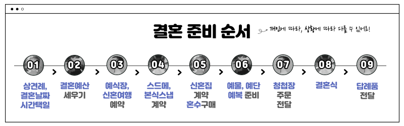 결혼을 준비하기 위해서는 전체적인 일정을 파악하고, 어떤 시기에 어떤 부분을 준비해야 하는지의 흐름을 알고 있는 것이 중요합니다😉