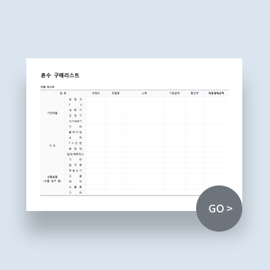 혼수 구매리스트 서식입니다. 혼수로 구매할 내역을 리스트로 정리할 수 있는 서식입니다. 내가 구매해야 하는 혼수 목록을 먼저 작성하고 그에 따른 브랜드, 모델명, 스펙, 금액 등을 결정합니다.
