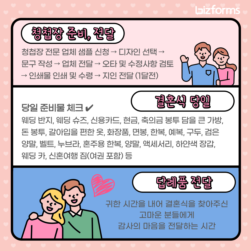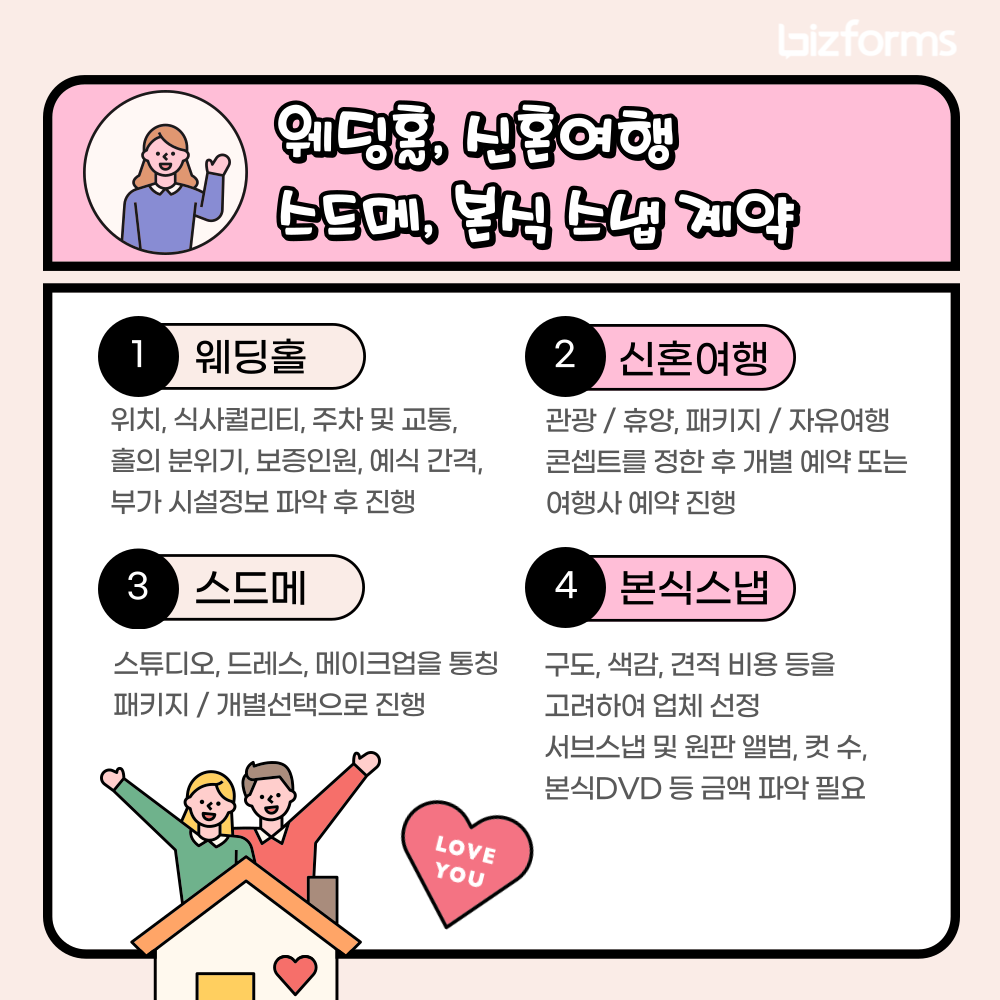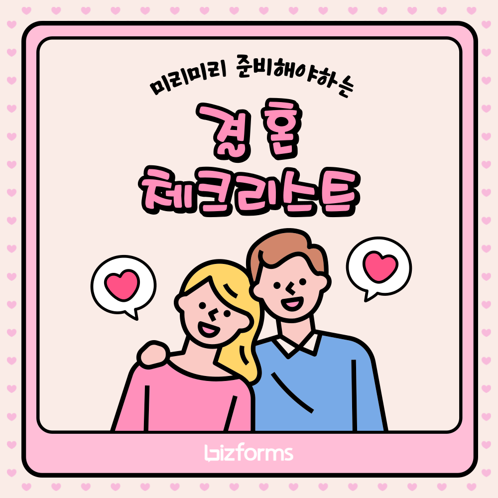 결혼을 조금 더 수월하게, 꼼꼼하게 준비하기 위한 계획과 함께 비즈폼이 추천드리는 결혼 체크리스트 서식을 통해 하나도 놓치지 말고 차근히 준비해 봅시다!