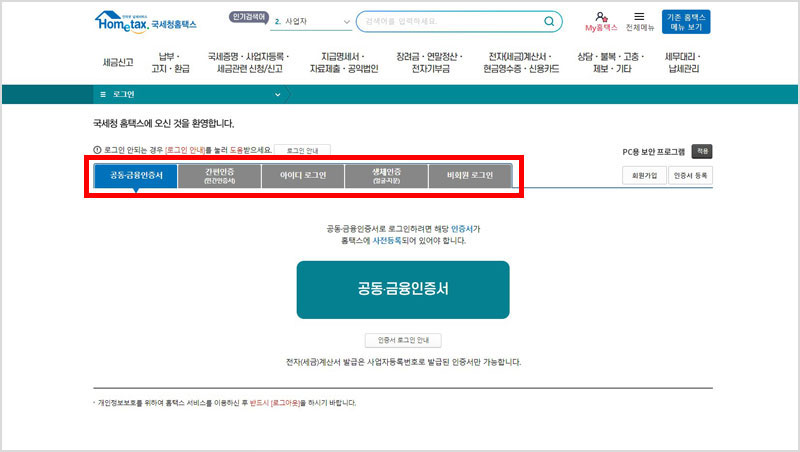 3️⃣ 홈택스 사업자 로그인 필요(아이디, 공동·금융인증서, 간편인증 등), 개인 회원으로는 이용할 수 없음.