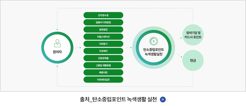 국민들의 탄소중립 생활 실천문화 확산을 위하여 다양한 민간기업의 친환경 활동 이용 시 이용 실적에 따라 인센티브를 지원하는 제도입니다.