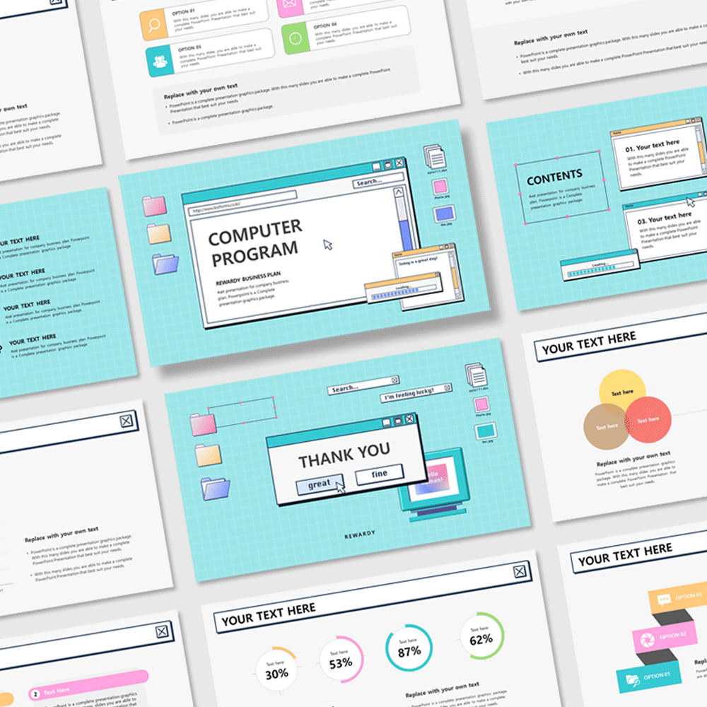 리워디는 PC, 태블릿, 모바일에서 사용할 수 있는 프로그램으로, 이를 고려하여 컴퓨터 프로그램의 일러스트 이미지를 활용하여 제작된 템플릿입니다. 이 템플릿은 비즈니스 용도 뿐만 아니라 더 편안한 분위기에서도 활용하기 좋습니다.