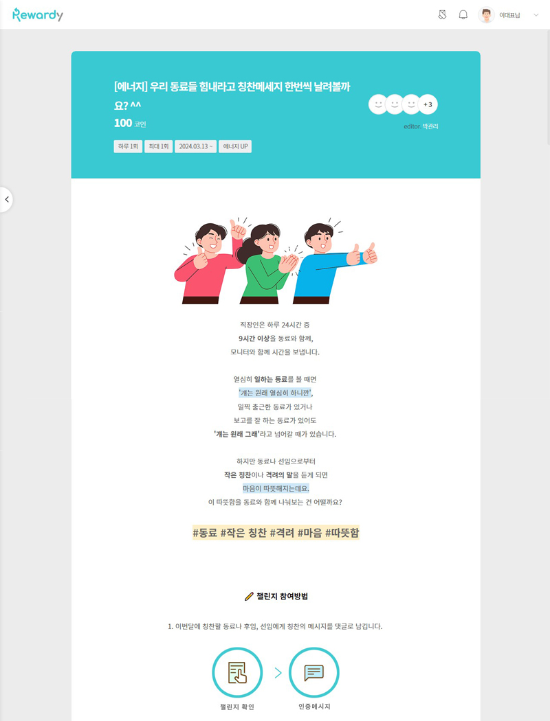 리워디 무료체험을 통해 체험해 볼 수 있는 챌린지입니다. 삭막한 우리 회사 분위기가 다정했으면 하는 회사에 추천하는 챌린지입니다. 챌린지를 통해 참여방법을 확인하고 참여 완료를 하면 챌린지 만들 때 부여된 공용 코인이 적립됩니다.