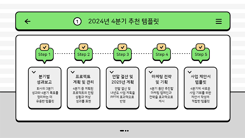 빠르게 흘려가는 한 해🕛, 2024년의 절반이 지나 벌써 마지막 분기인 4분기가 찾아왔습니다. 4분기를 맞아 비즈니스나 보고, 프레젠테이션에서 활용할 수 있는 PPT 템플릿을 많이 찾으시는데요, 4분기에는 연말 성과 정리, 내년도 계획 수립 등 중요한 발표들이 많기 때문에, 적합한 PPT 템플릿을 선택하는 것이 중요합니다.