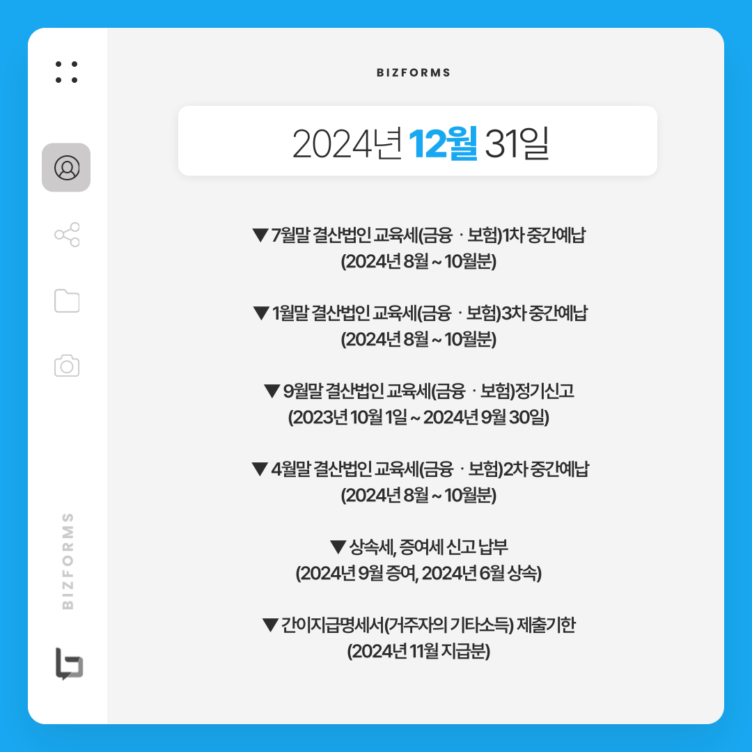 - 12월말 결산법인 교육세(금융ㆍ보험)3차 중간예납 / 2024년 7월~9월분